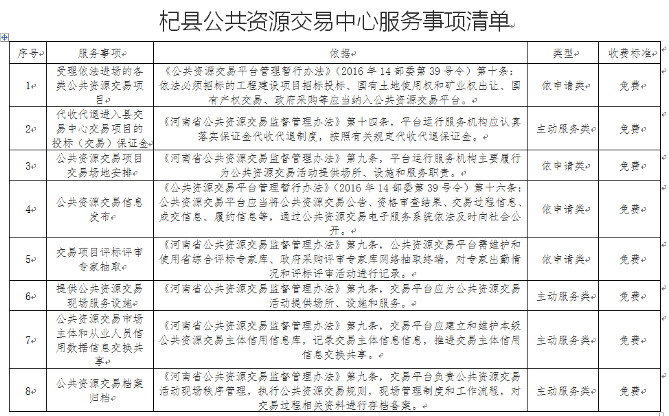 杞县公共资源交易中心服务事项清单