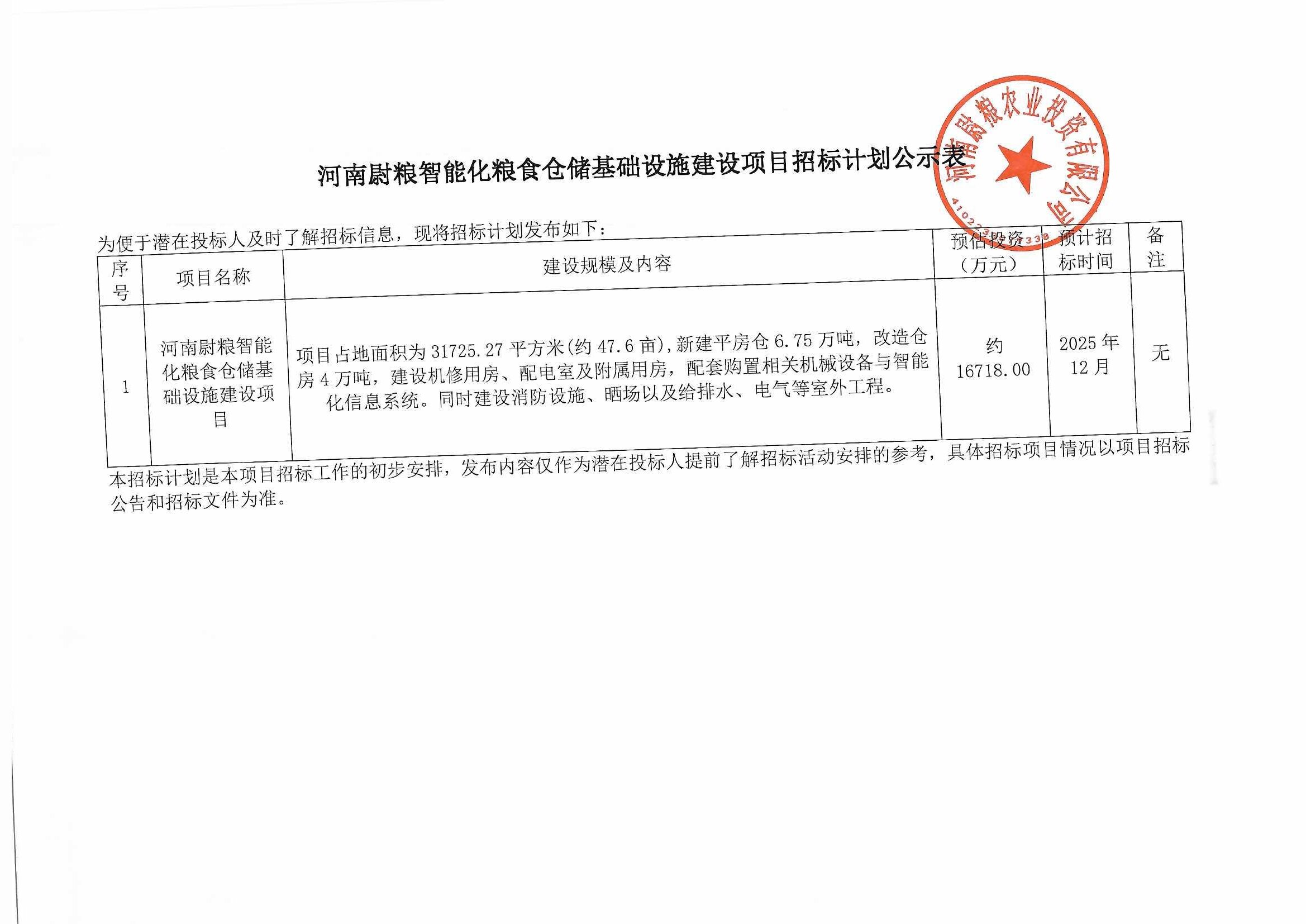 河南尉粮智能化粮食仓储基础设施建设项目招标计划公示表