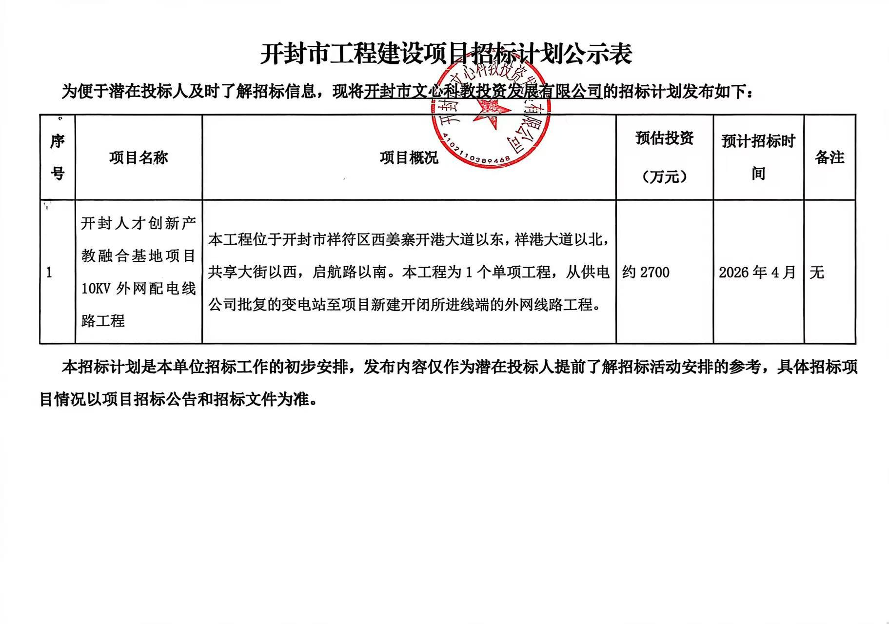 为便于潜在投标人及时了解招标信息,现将开封市文心科教投资发展有限公司的招标计划发布如下: