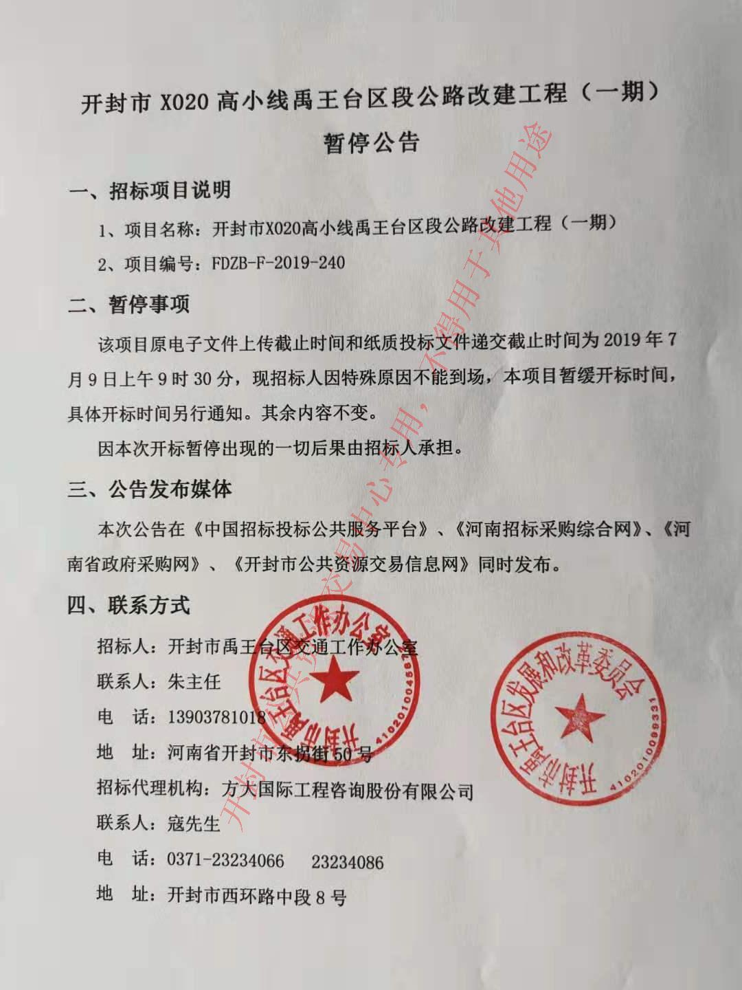 1、项目名称:开封市X020高小线禹王台区段公路改建工程(一期)
