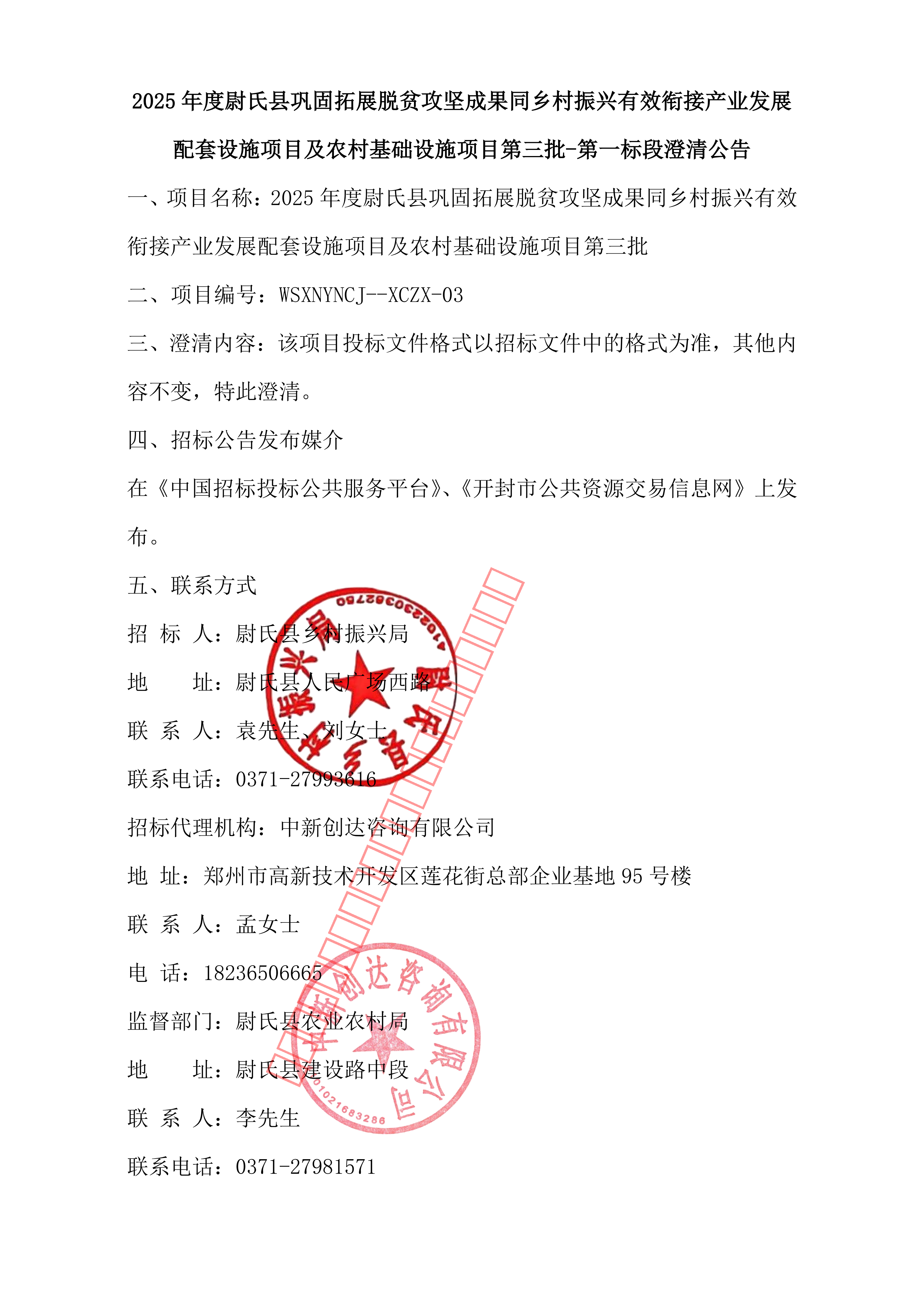 2025年度尉氏县巩固拓展脱贫攻坚成果同乡村振兴有效衔接产业发展配套设施项目及农村基础设施项目第三批-第一标段澄清公告