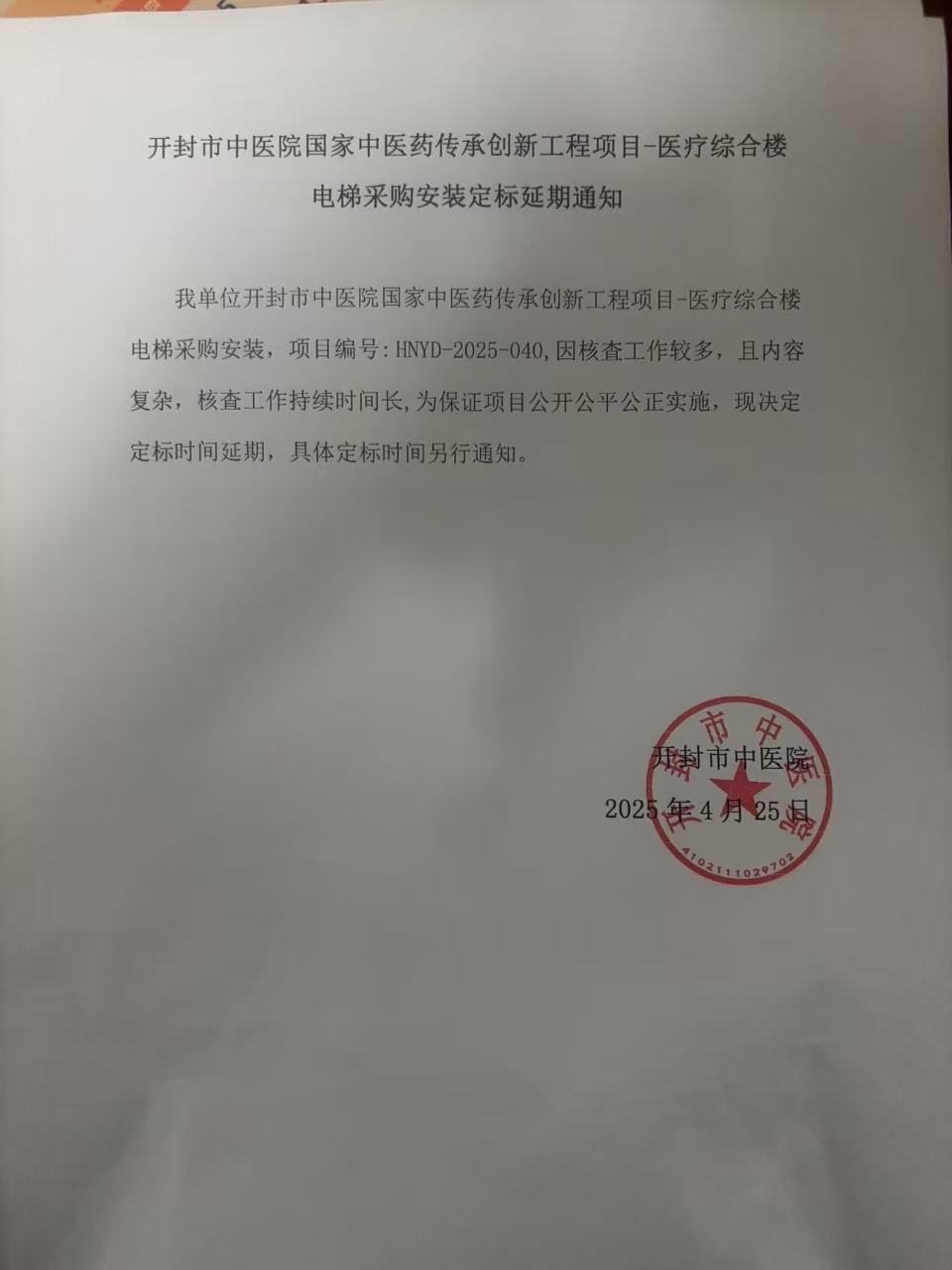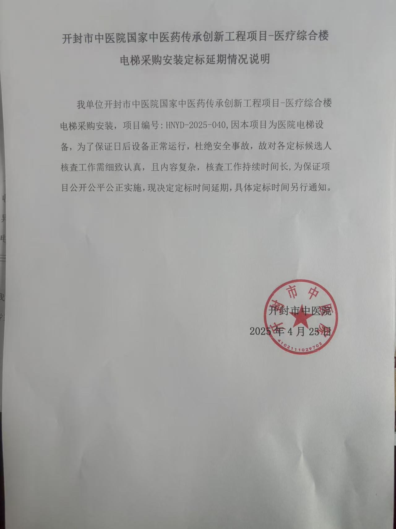 我单位开封市中医院国家中医药传承创新工程项目-医疗综合楼电梯采购安装,项目编号: HNYD-2025-040,因核査工作较多,且内容复杂,核査工作持续时间长,为保证项目公开公平公正实施,现决定定标时间延期,具体定标时间另行通知。
