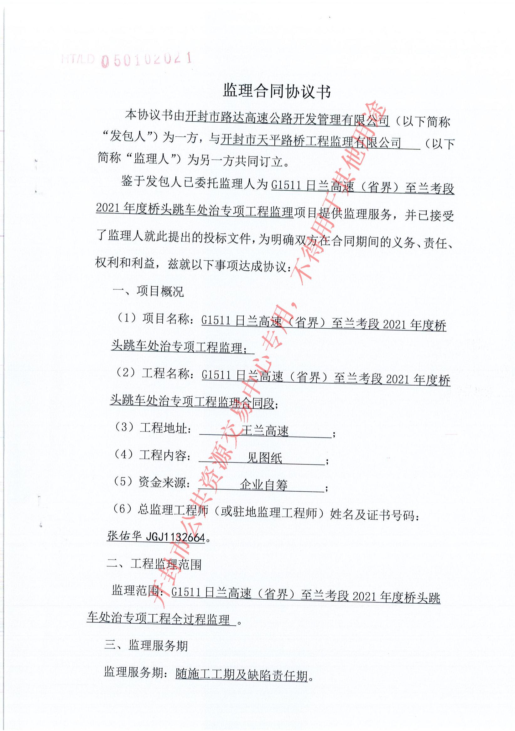 | 分包名称: | 监理标段:G1511日兰高速(省界)至兰考段2021年度桥头跳车处治专项工程监理 | 合同名称: | G1511日兰高速(省界)至兰考段2021年度桥头跳车处治专项工程监理合同 |
