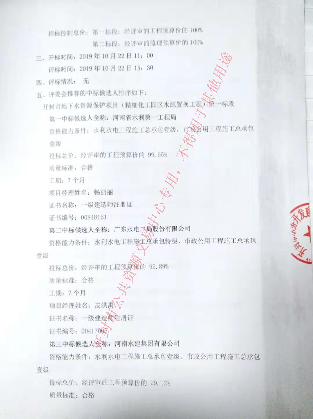 第一中标候选人全称:河南省水利第一工程局