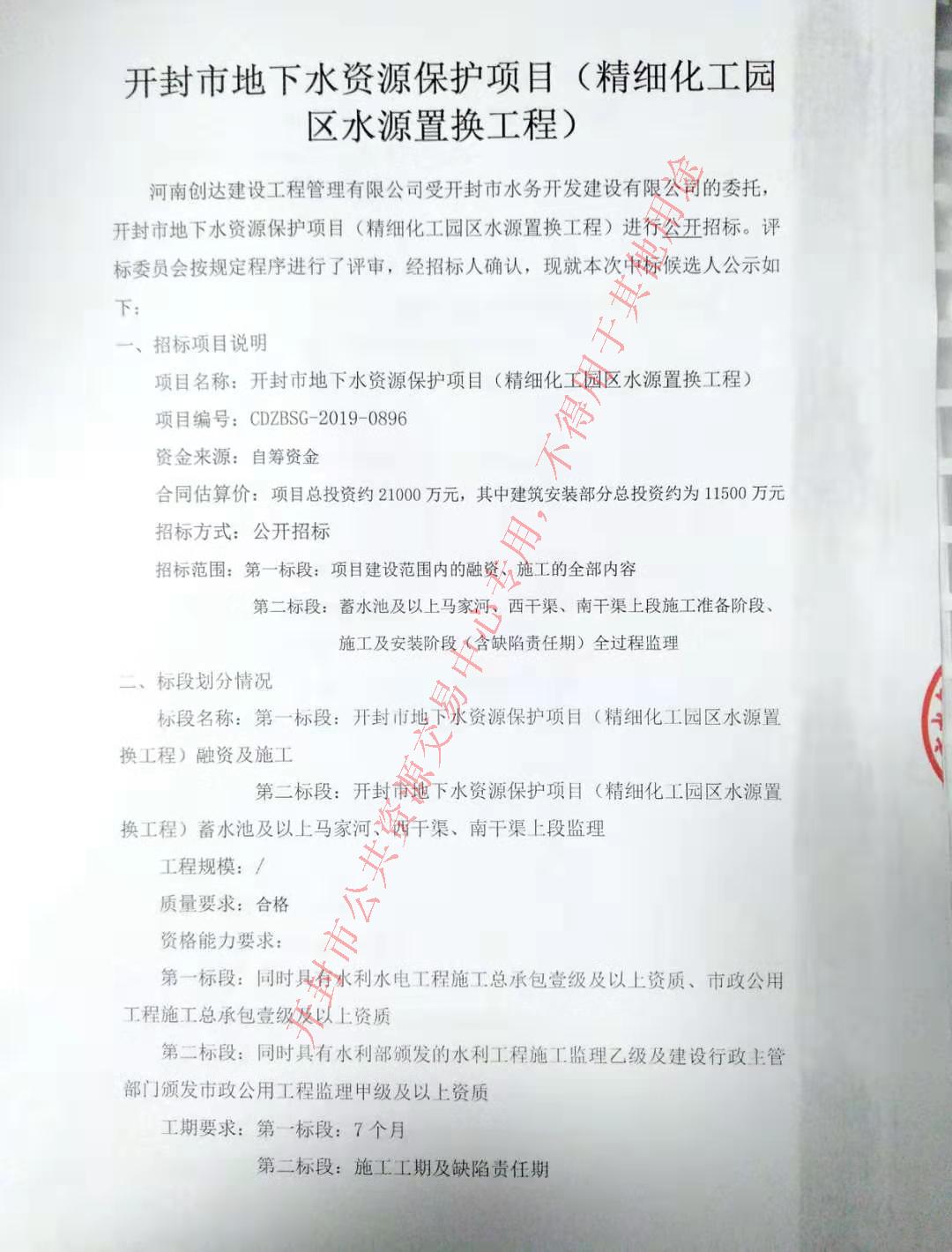标段名称:第一标段:开封市地下水资源保护项目(精细化工园区水源置换工程)融资及施工