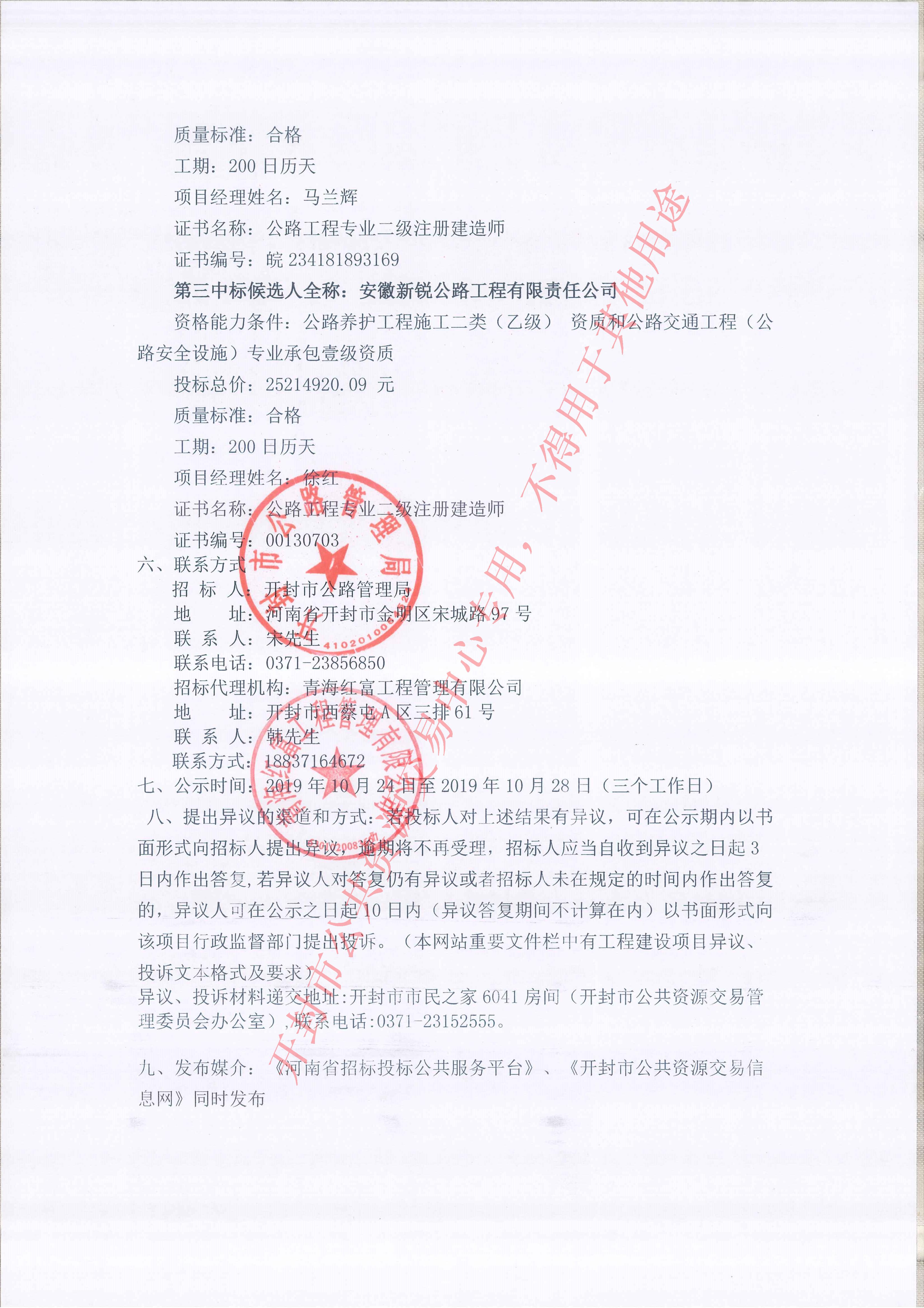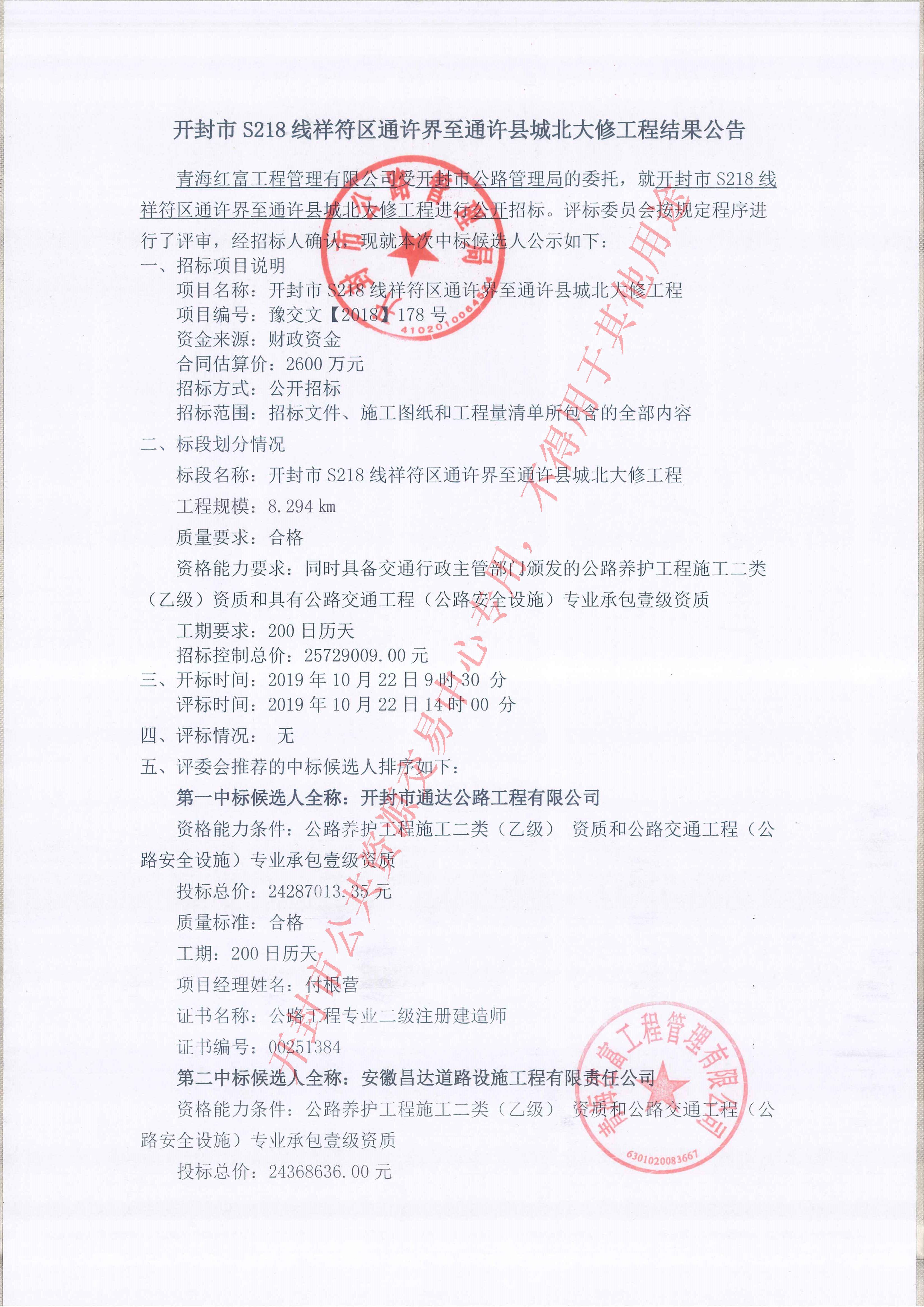青海红富工程管理有限公司受开封市公路管理局的委托,就开封市S218线祥符区通许界至通许县城北大修工程进行公开招标。评标委员会按规定程序进行了评审,经招标人确认,现就本次中标候选人公示如下: