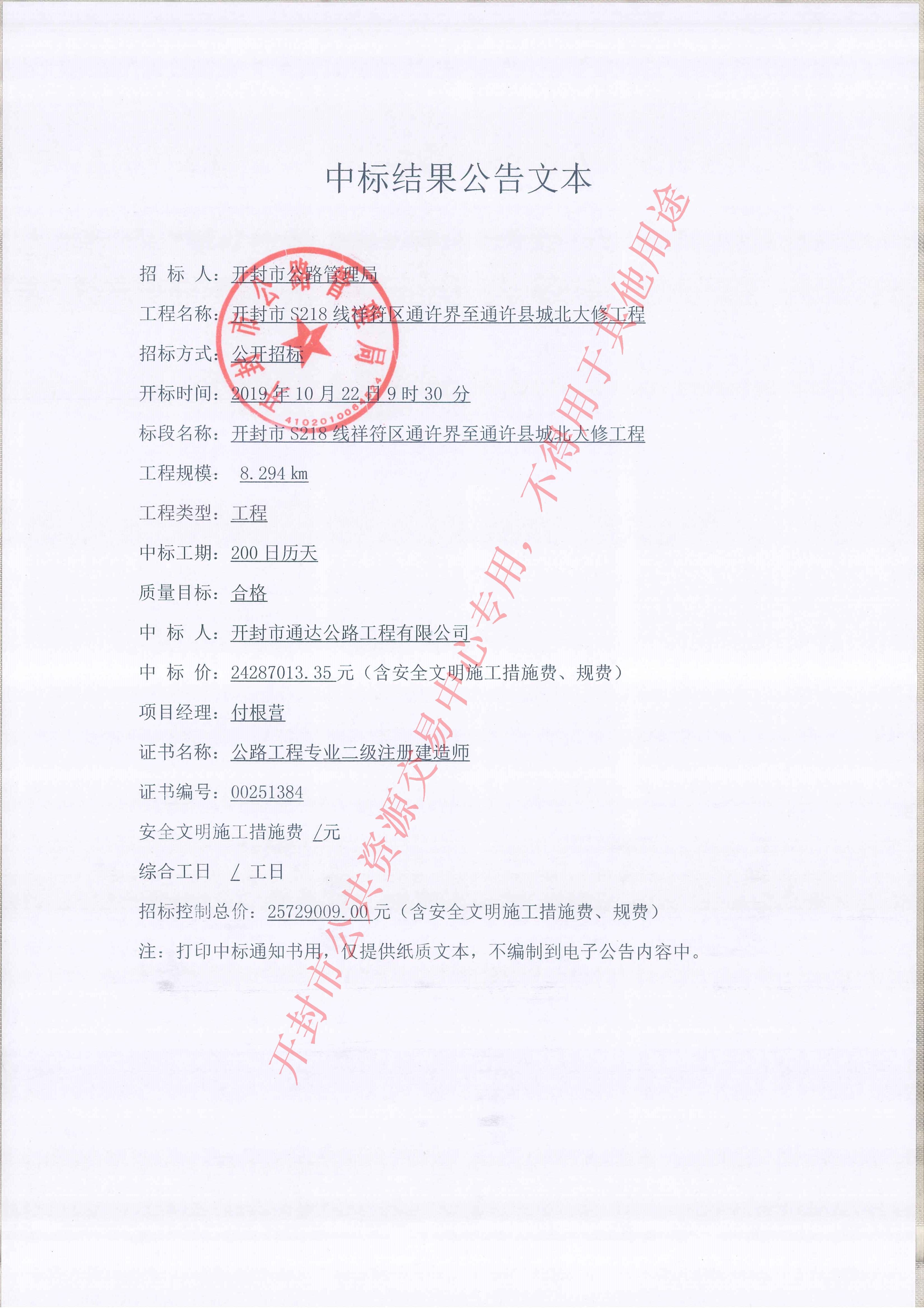 开封市S218线祥符区通许界至通许县城北大修工程结果公告