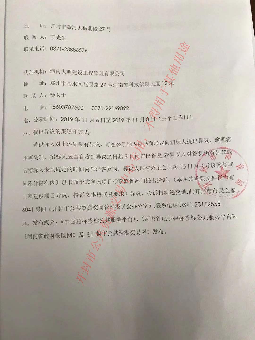 若投标人对上述结果有异议,可在公示期内以书面形式向招标人提出异议,逾期将不再受理,招标人应当自收到异议之日起3日内作出答复,若异议人对答复仍有异议或者招标人未在规定的时间内作出答复的,异议人可在公示之日起10日内(异议答复期间不计算在内)以书面形式向该项目行政监督部门提出投诉。(本网站重要文件栏中有工程建设项目异议、投诉文本格式及要求)异议、投诉材料递交地址:开封市市民之家6041房间(开封市公共资源交易管理委员会办公室),联系电话:0371-23152555