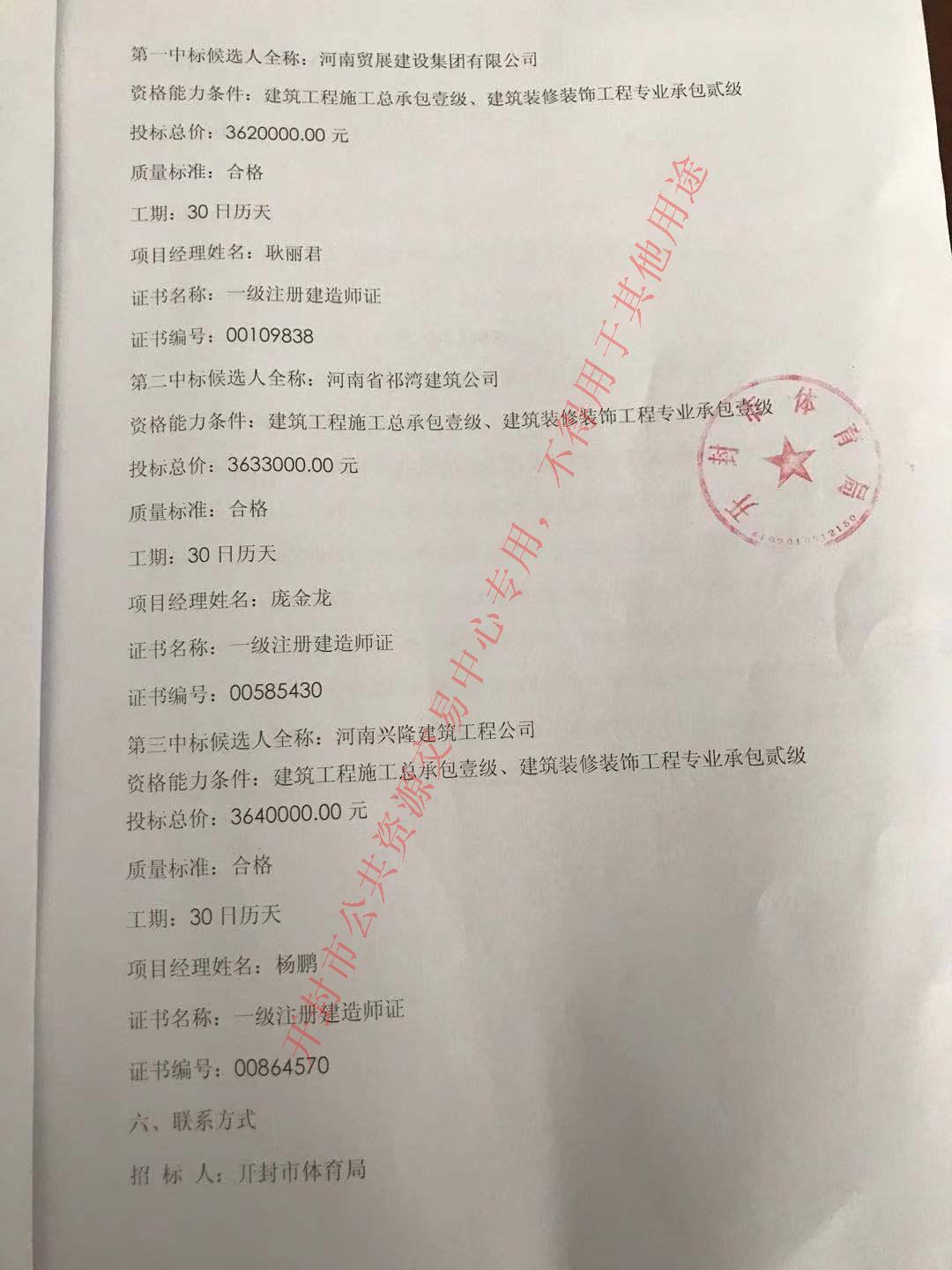 河南大明建设工程管理有限公司受开封市体育局的委托,就开封市体育场东运动场维修改造工程进行竞争性谈判,评标委员会按规定程序进行了评审,经招标人确认,现就本次中标候选人公示如下: