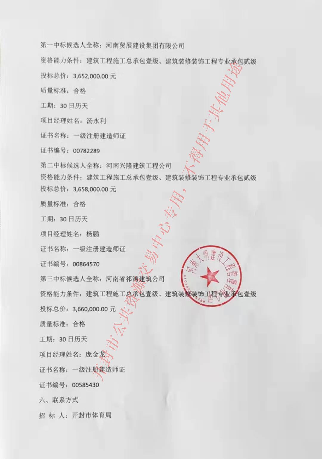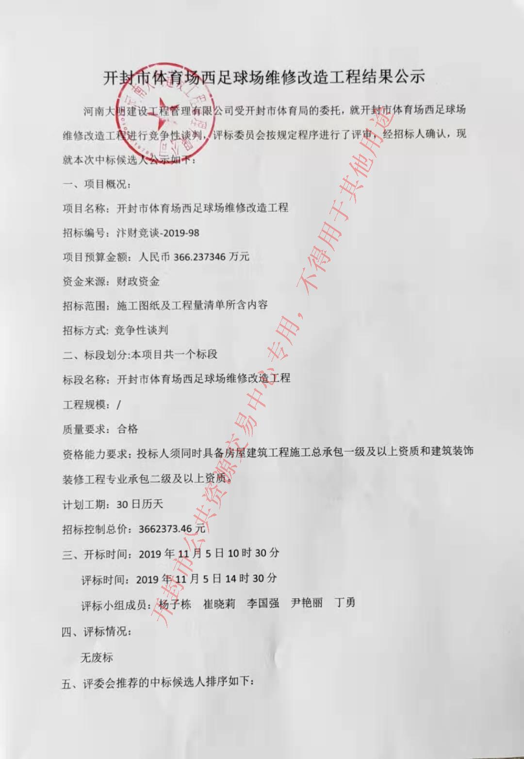 河南大明建设工程管理有限公司受开封市体育局的委托,就开封市体育场西足球场维修改造工程进行竞争性谈判,评标委员会按规定程序进行了评审,经招标人确认,现就本次中标候选人公示如下: