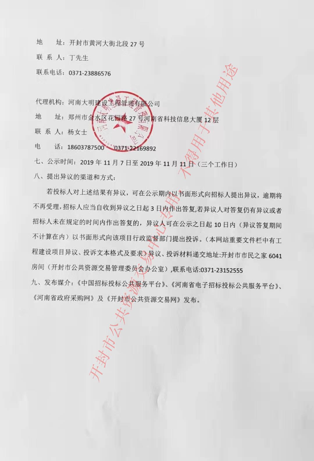 若投标人对上述结果有异议,可在公示期内以书面形式向招标人提出异议,逾期将不再受理,招标人应当自收到异议之日起3日内作出答复,若异议人对答复仍有异议或者招标人未在规定的时间内作出答复的,异议人可在公示之日起10日内(异议答复期间不计算在内)以书面形式向该项目行政监督部门提出投诉。(本网站重要文件栏中有工程建设项目异议、投诉文本格式及要求)异议、投诉材料递交地址:开封市市民之家6041房间(开封市公共资源交易管理委员会办公室),联系电话:0371-23152555