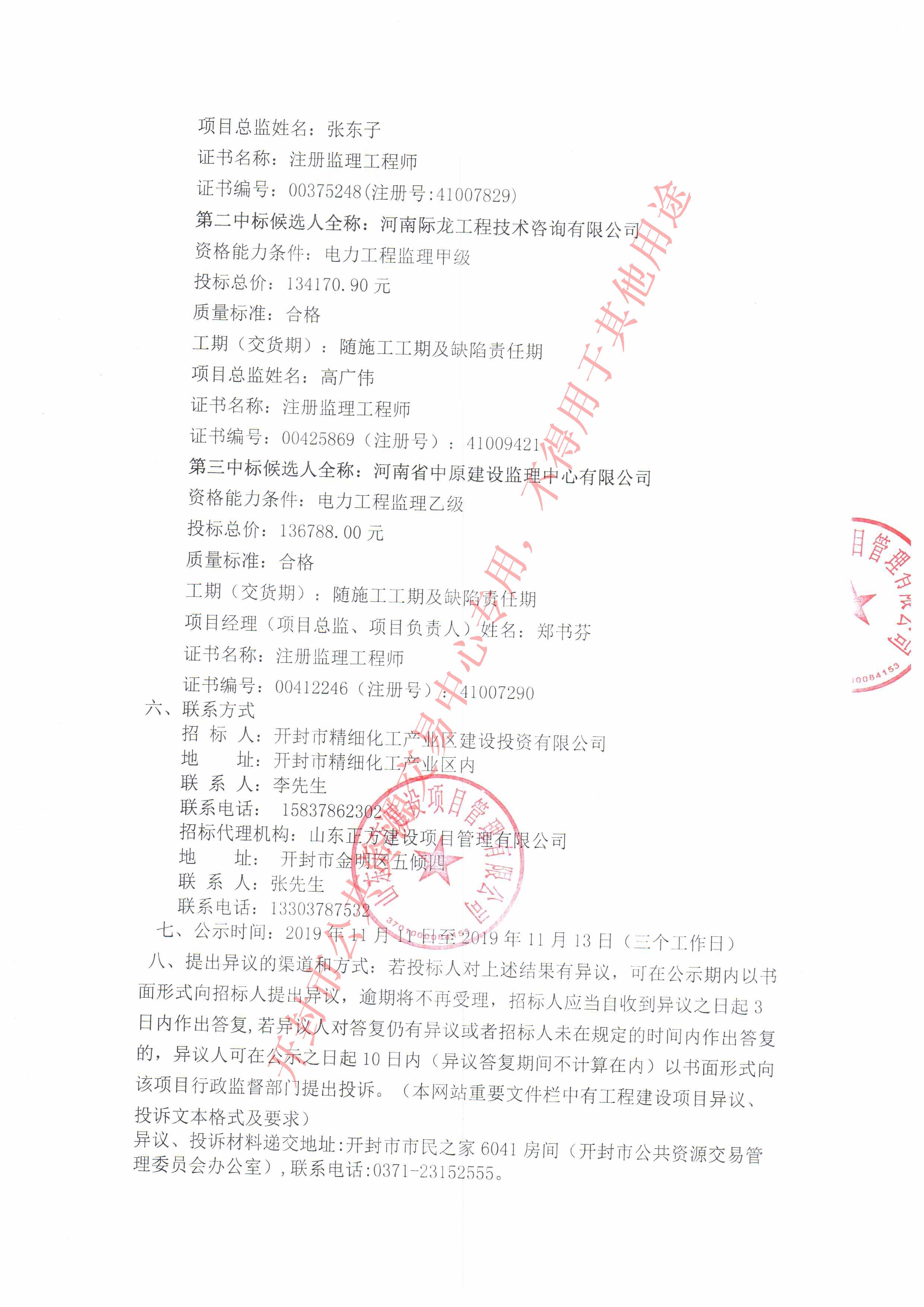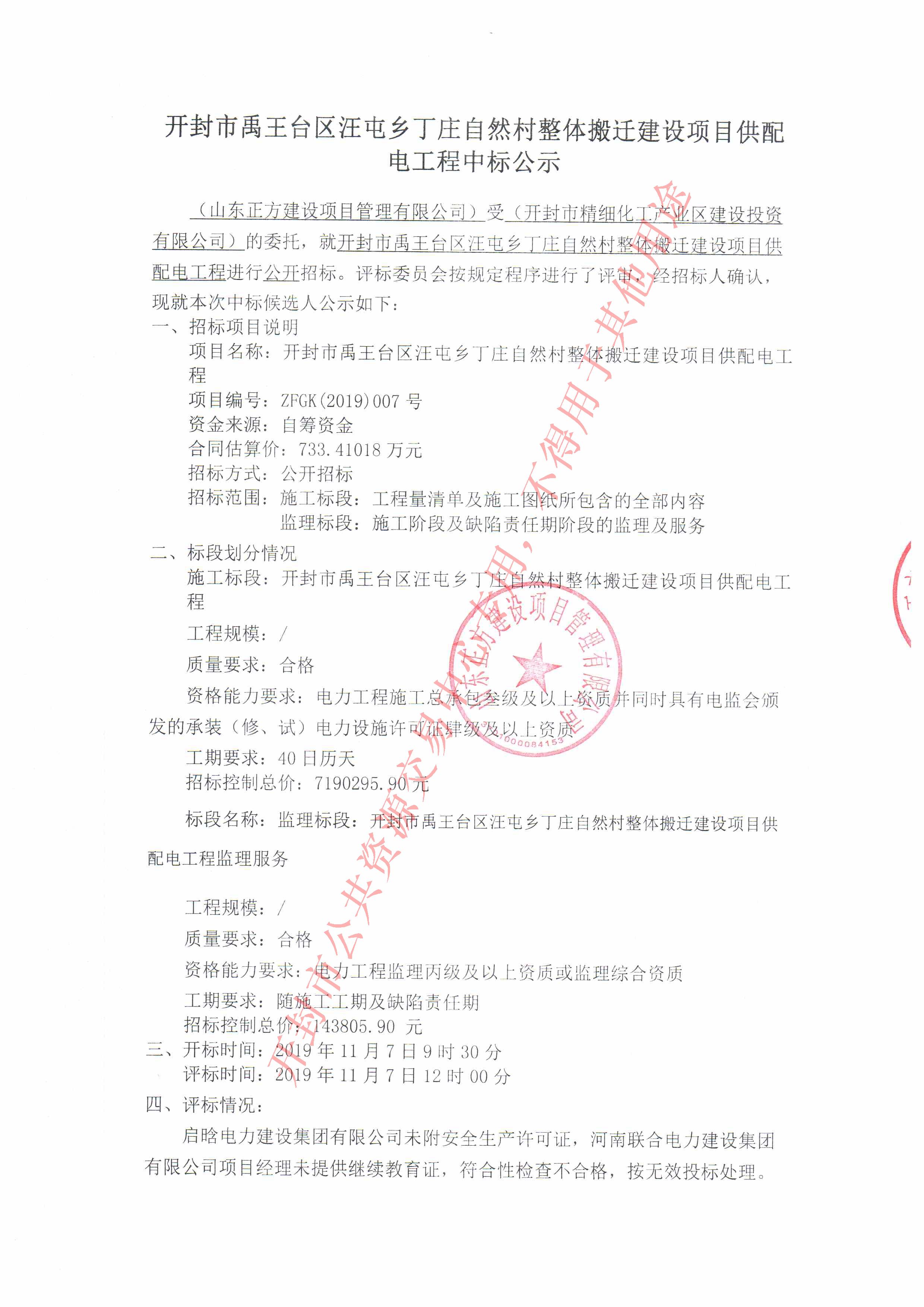 (山东正方建设项目管理有限公司)受(开封市精细化工产业区建设投资有限公司)的委托,就开封市禹王台区汪屯乡丁庄自然村整体搬迁建设项目供配电工程进行公开招标。评标委员会按规定程序进行了评审,经招标人确认,现就本次中标候选人公示如下: