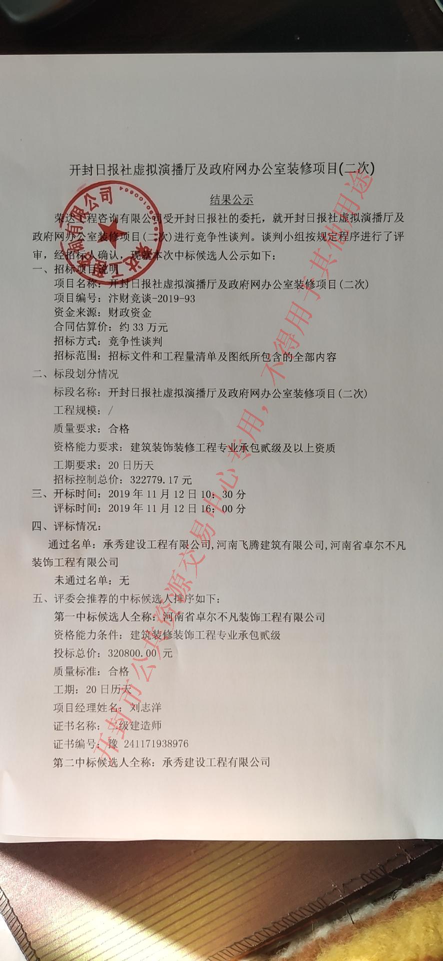 标段名称:开封日报社虚拟演播厅及政府网办公室装修项目(二次)