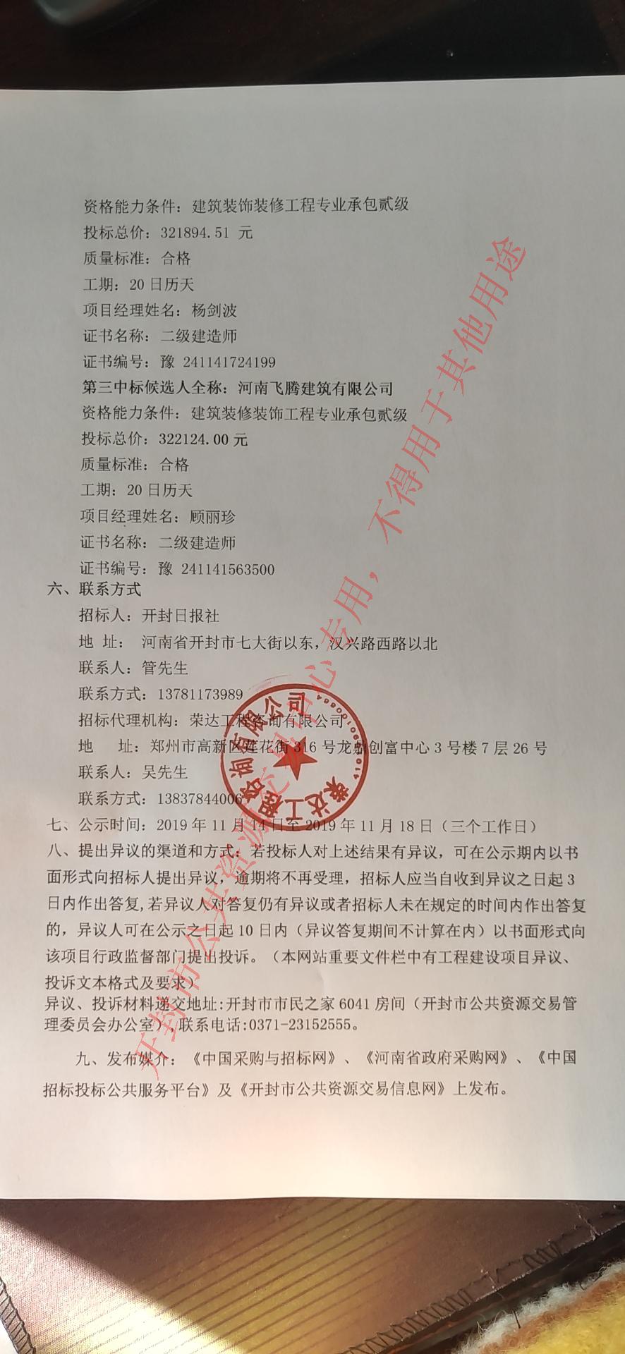 荣达工程咨询有限公司受开封日报社的委托,就开封日报社虚拟演播厅及政府网办公室装修项目(二次)进行竞争性谈判。谈判小组按规定程序进行了评审,经招标人确认,现就本次中标候选人公示如下: