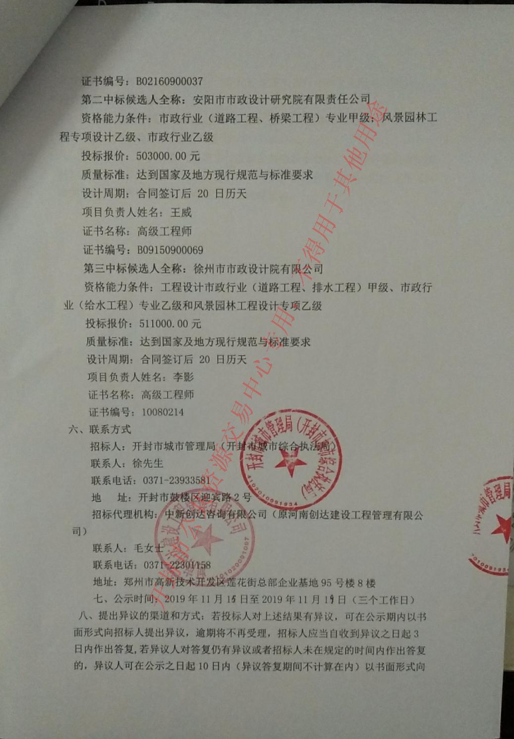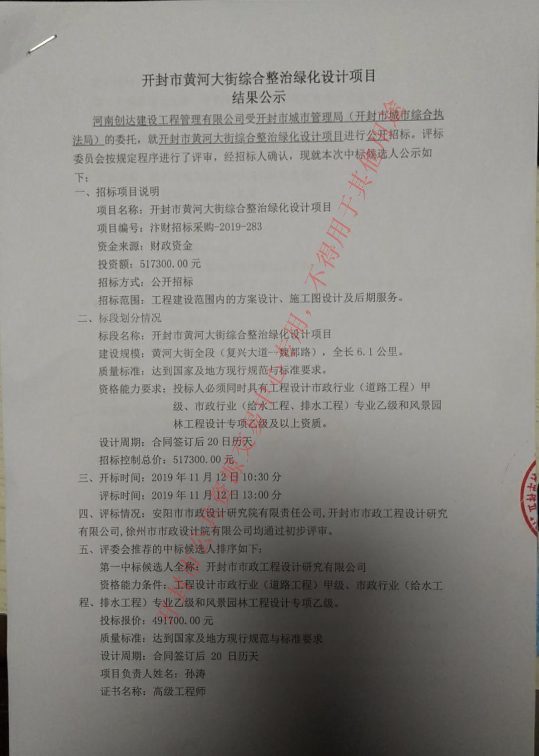 第一中标候选人全称:开封市市政工程设计研究有限公司