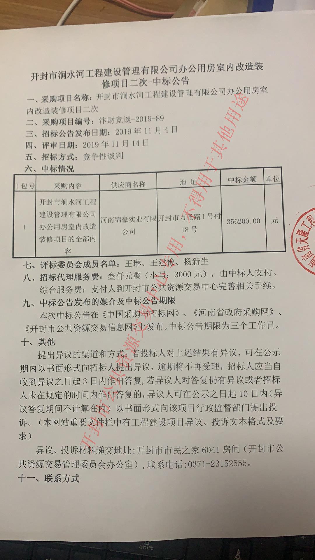 开封市涧水河工程建设管理有限公司办公用房室内改造装修项目二次-中标公告