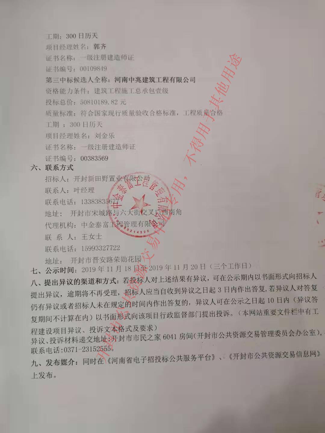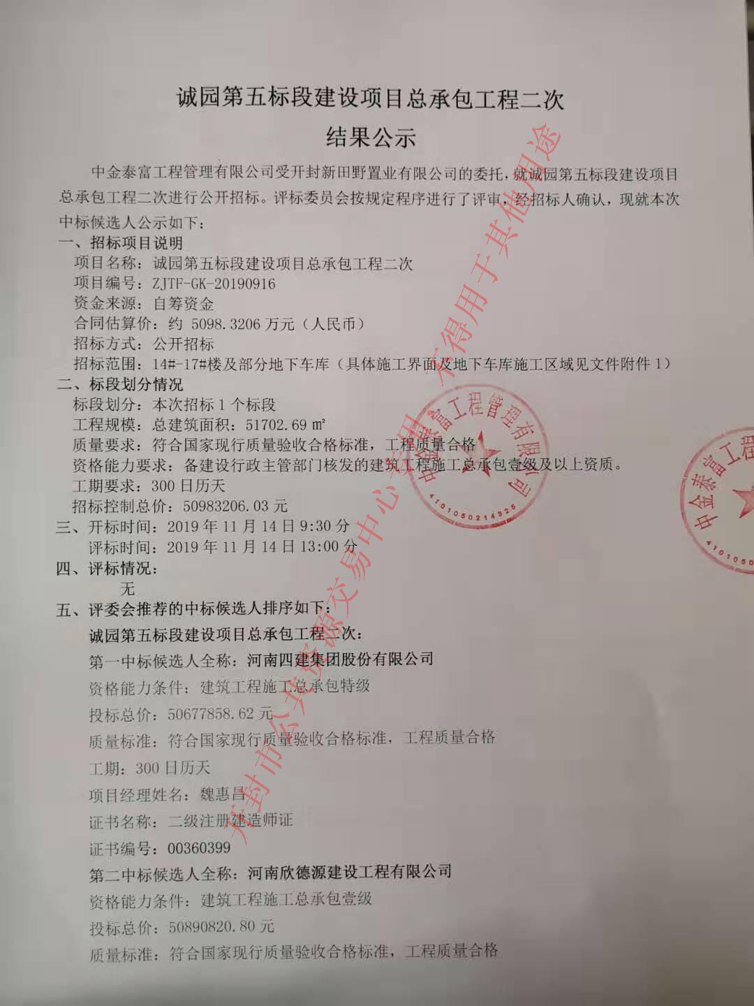 中金泰富工程管理有限公司受开封新田野置业有限公司的委托,就诚园第五标段建设项目总承包工程二次进行公开招标。评标委员会按规定程序进行了评审,经招标人确认,现就本次中标候选人公示如下: