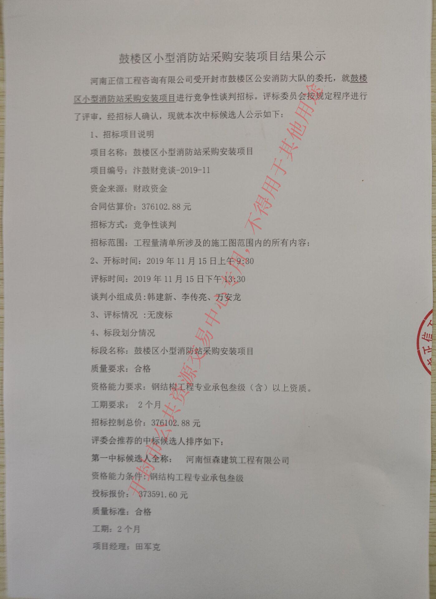 河南正信工程咨询有限公司受开封市鼓楼区公安消防大队的委托,就鼓楼区小型消防站采购安装项目进行竞争性谈判招标。评标委员会按规定程序进行了评审,经招标人确认,现就本次中标候选人公示如下: