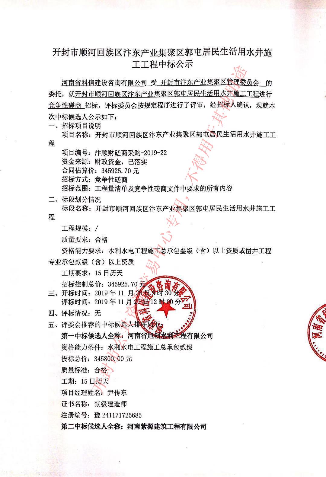 开封市顺河回族区汴东产业集聚区郭屯居民生活用水井施工工程中标公示