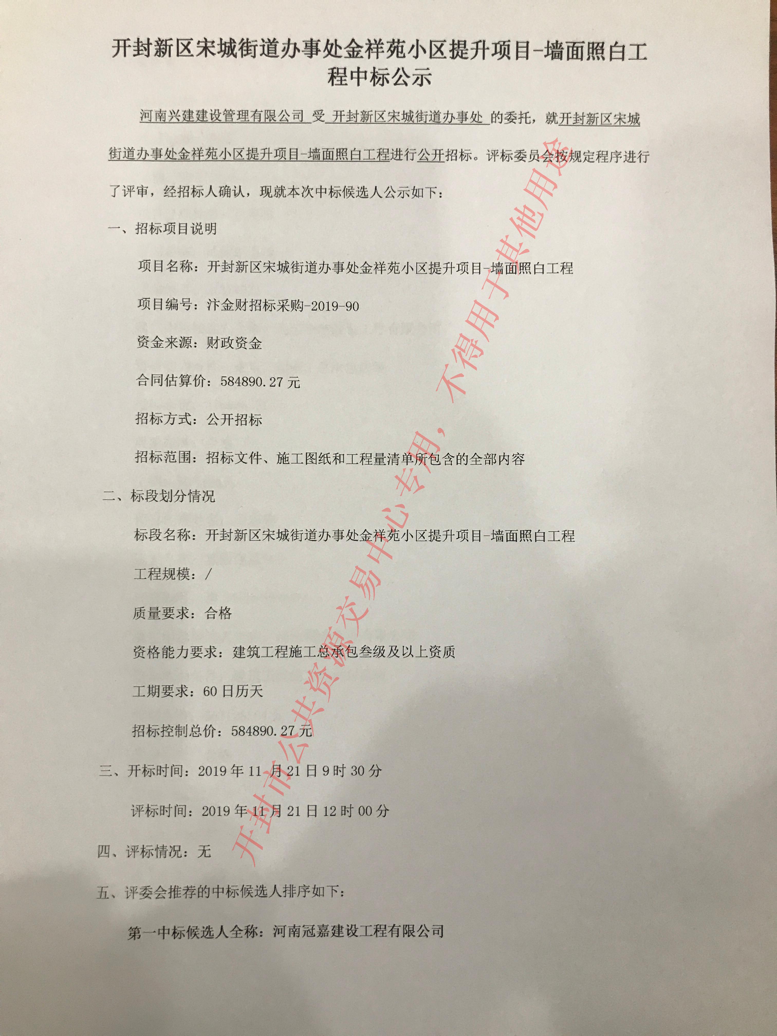 开封新区宋城街道办事处金祥苑小区提升项目-墙面照白工程中标公示