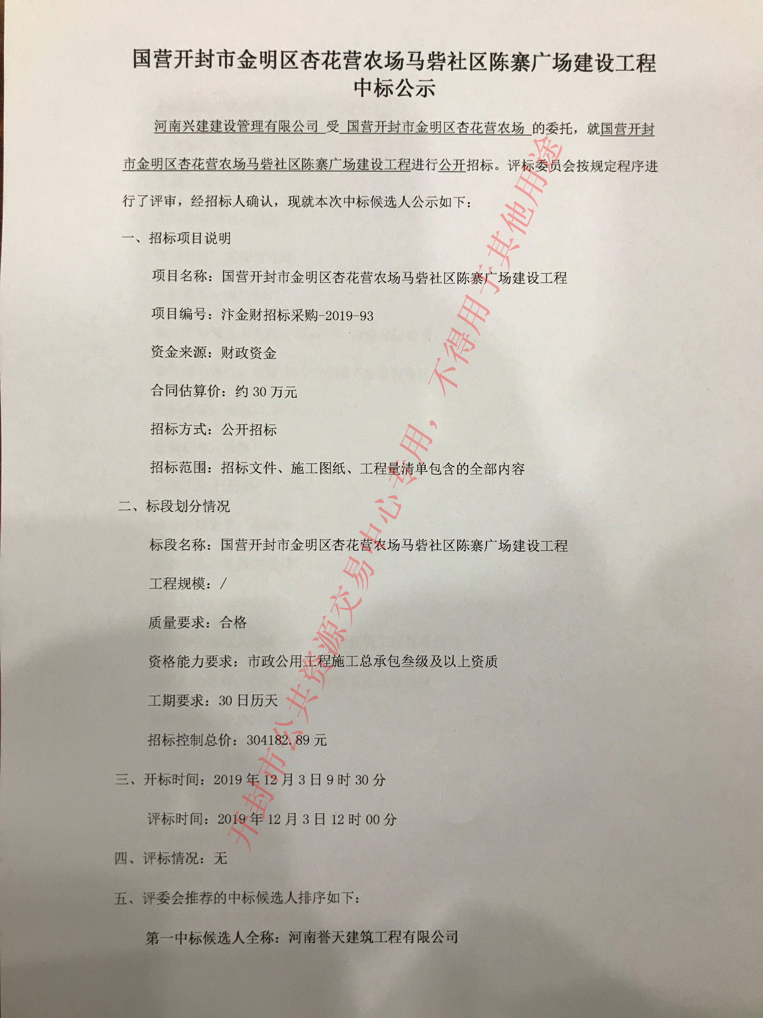 河南兴建建设管理有限公司 受 国营开封市金明区杏花营农场 的委托,就国营开封市金明区杏花营农场马砦社区陈寨广场建设工程进行公开招标。评标委员会按规定程序进行了评审,经招标人确认,现就本次中标候选人公示如下: