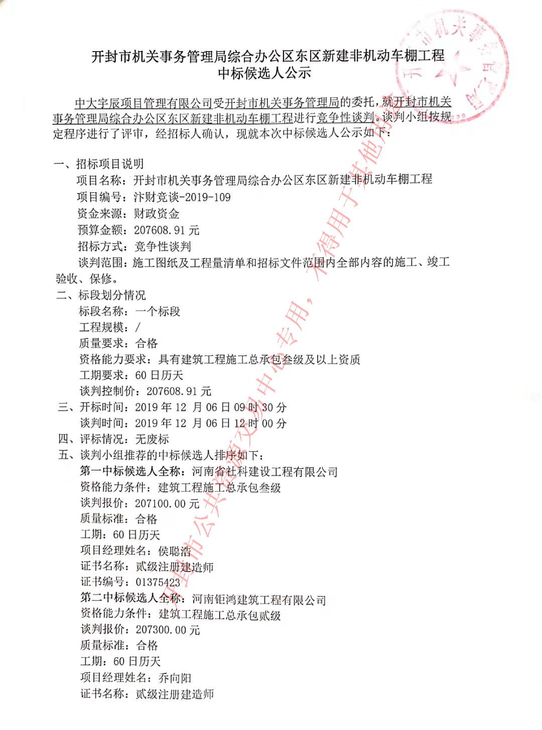 中大宇辰项目管理有限公司受开封市机关事务管理局的委托,就开封市机关事务管理局综合办公区东区新建非机动车棚工程进行竞争性谈判。谈判小组按规定程序进行了评审,经招标人确认,现就本次中标候选人公示如下: