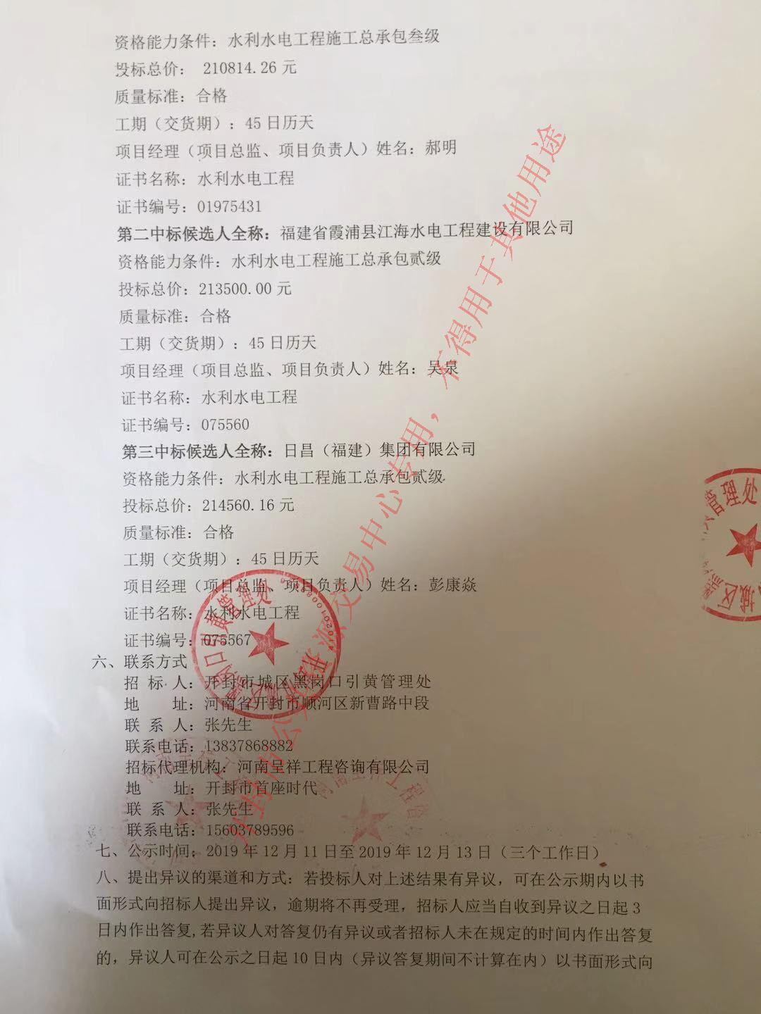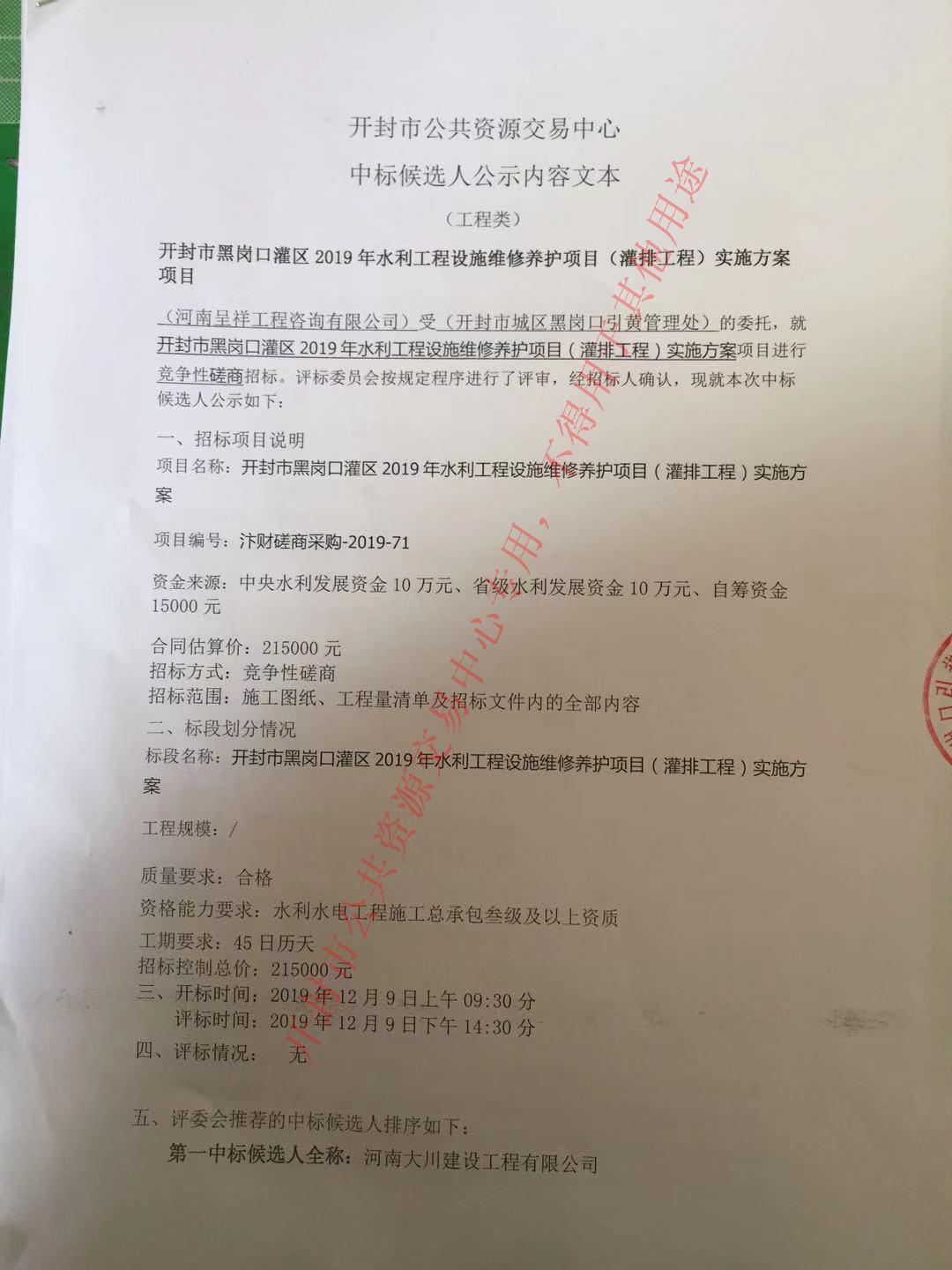 (河南呈祥工程咨询有限公司)受(开封市城区黑岗口引黄管理处)的委托,就开封市黑岗口灌区2019年水利工程设施维修养护项目(灌排工程)实施方案项目进行竞争性磋商招标。评标委员会按规定程序进行了评审,经招标人确认,现就本次中标候选人公示如下: