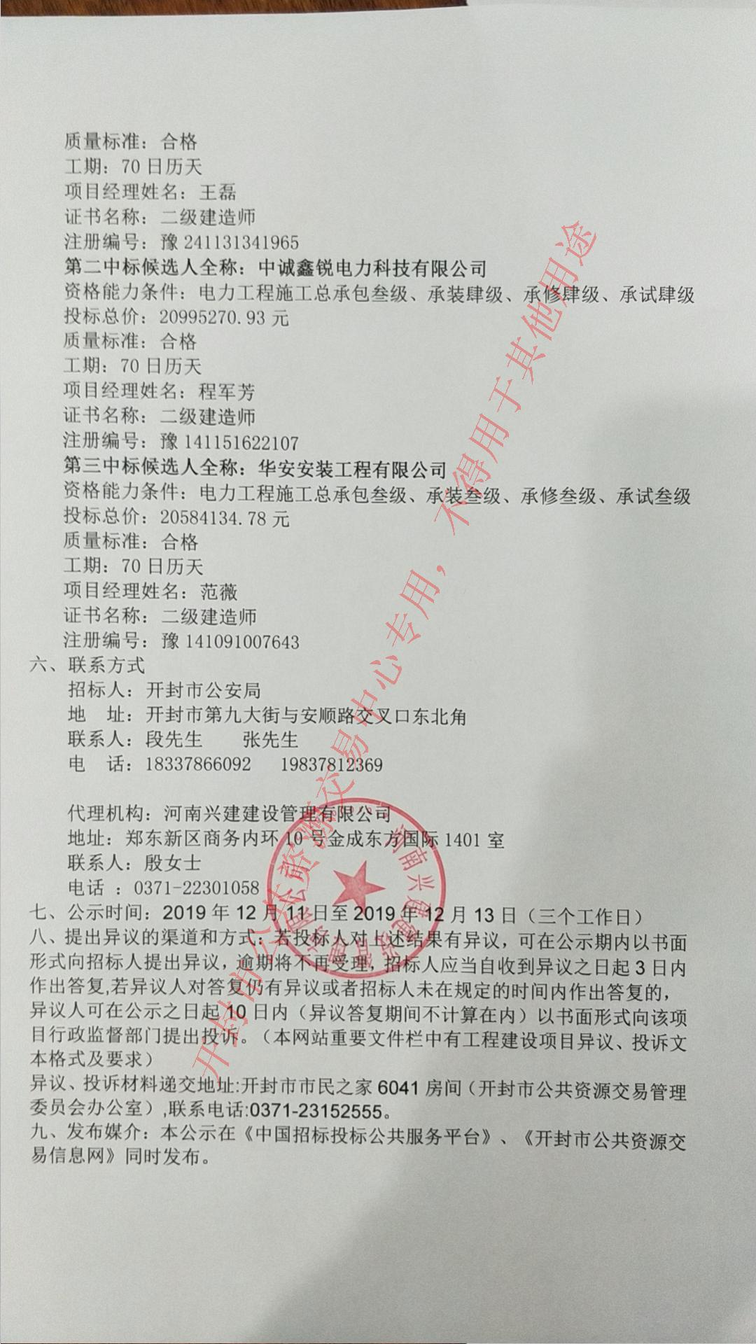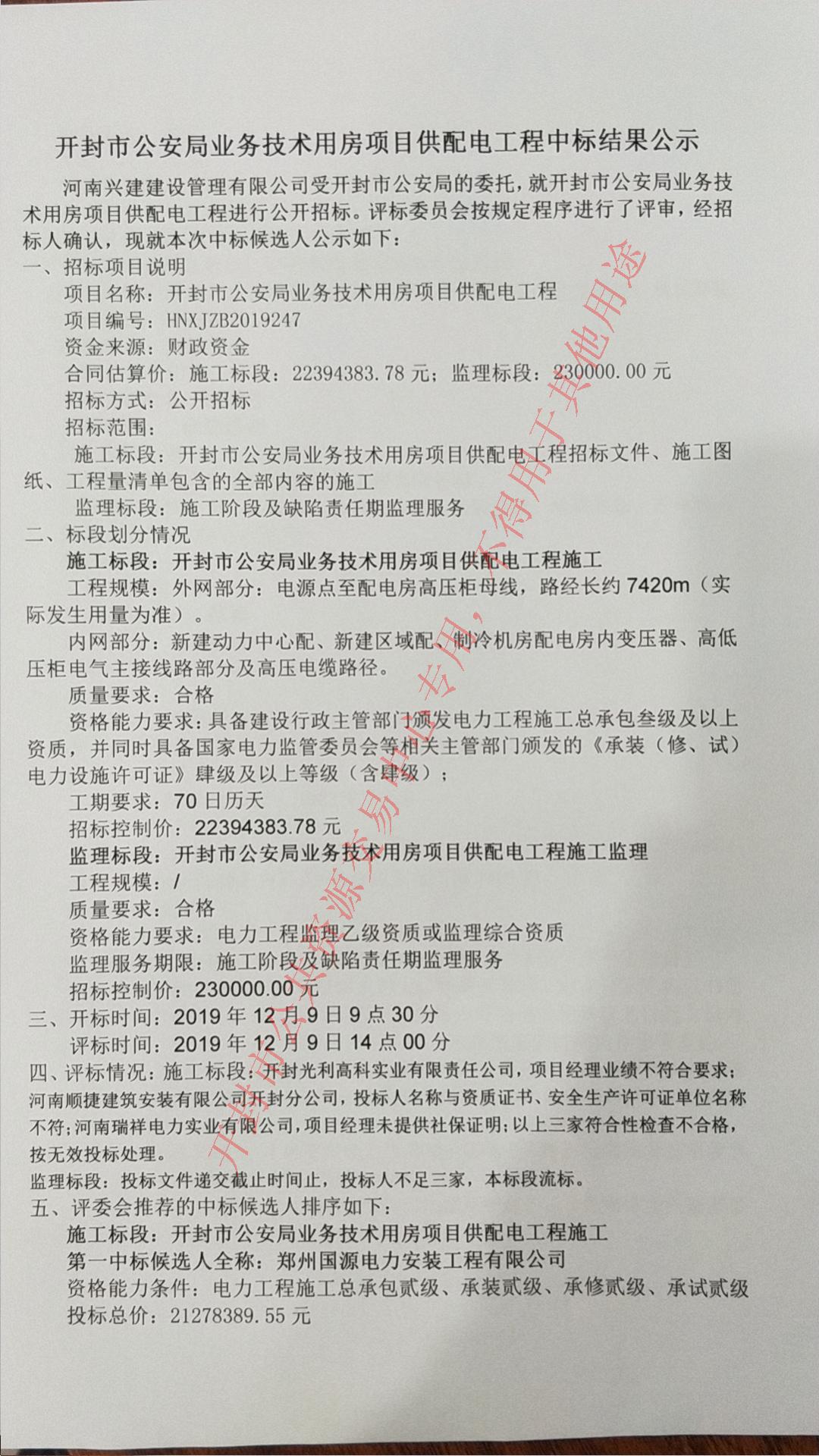 开封市公安局业务技术用房项目供配电工程中标结果公示
