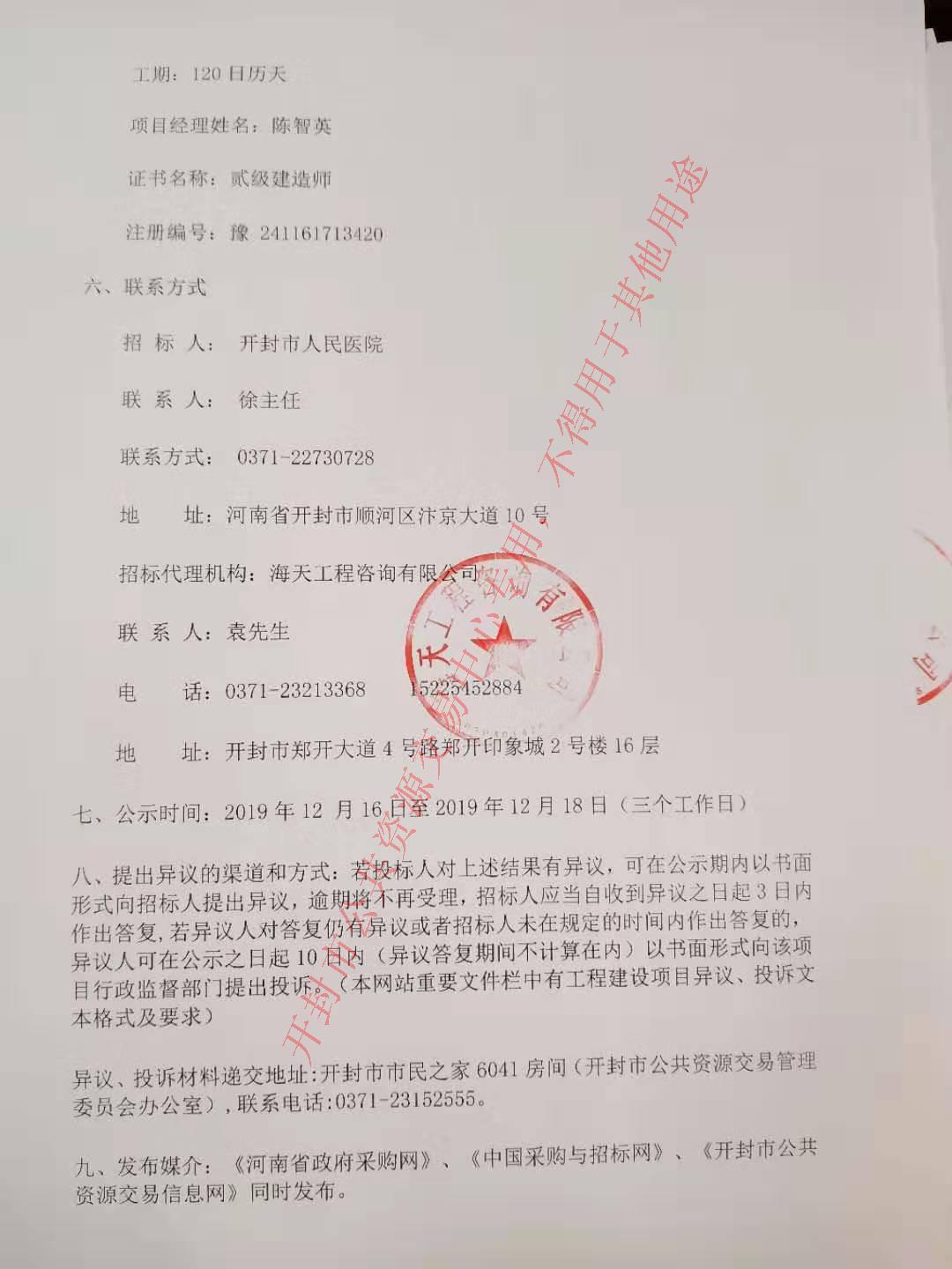 海天工程咨询有限公司受开封市人民医院的委托,就开封市人民医院西车库加层及车棚工程进行公开招标。评标委员会按规定程序进行了评审,经招标人确认,现就本次中标候选人公示如下: