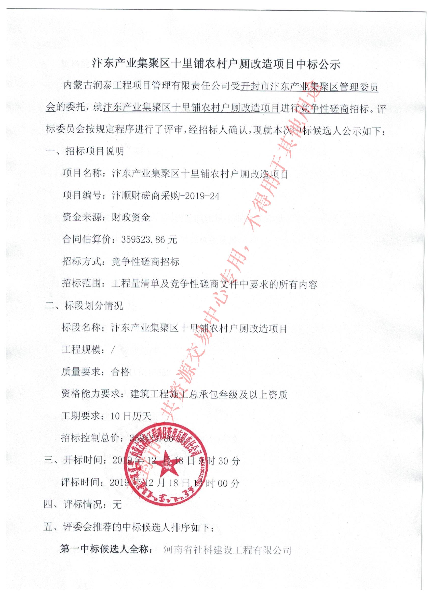 内蒙古润泰工程项目管理有限责任公司受开封市汴东产业集聚区管理委员会的委托,就汴东产业集聚区十里铺农村户厕改造项目进行竞争性磋商招标。评标委员会按规定程序进行了评审,经招标人确认,现就本次中标候选人公示如下: