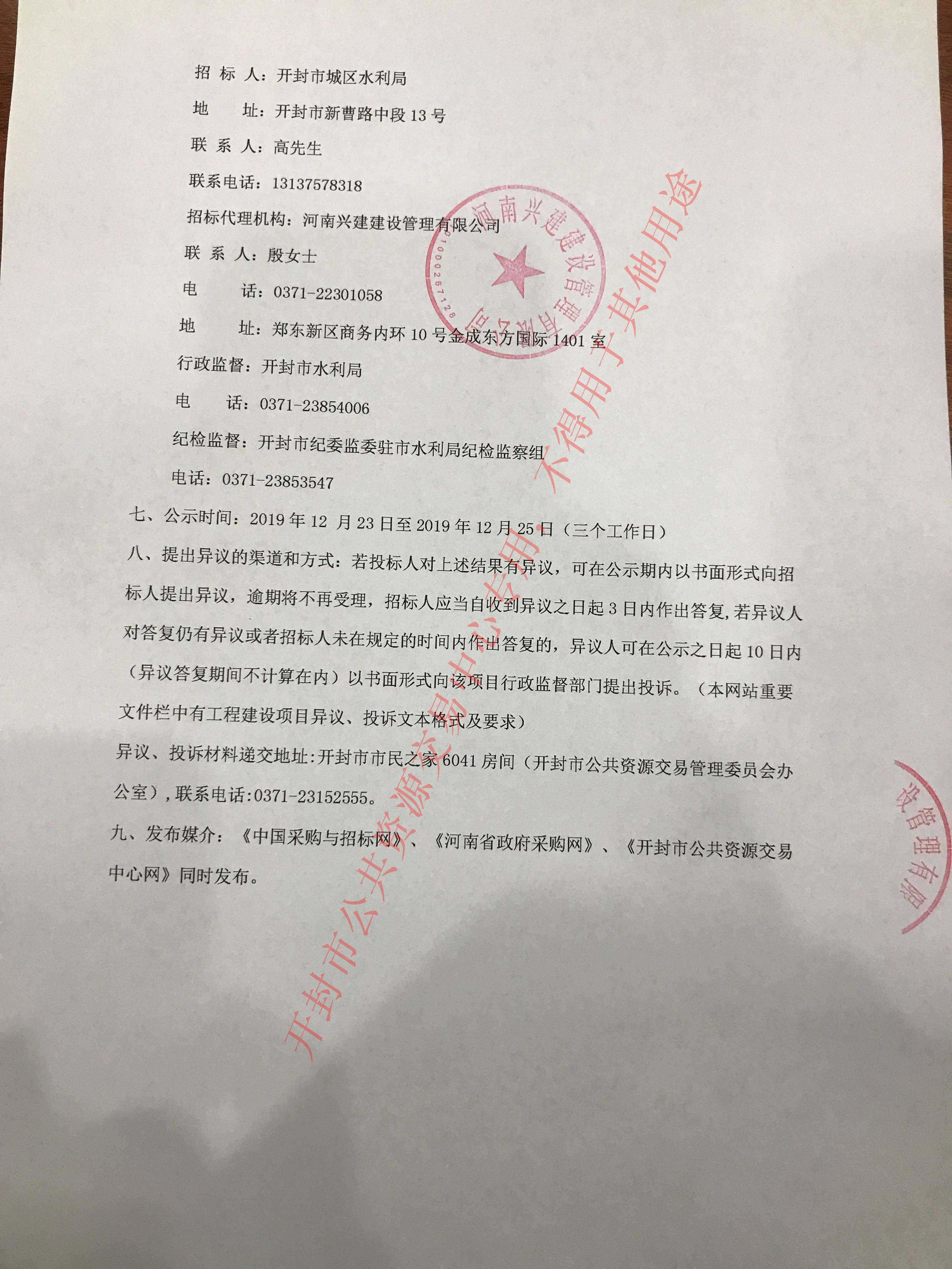 河南兴建建设管理有限公司 受开封市城区水利局的委托,就开封市城区2019年抗旱工程进行竞争性磋商招标。评标委员会按规定程序进行了评审,经招标人确认,现就本次中标候选人公示如下: