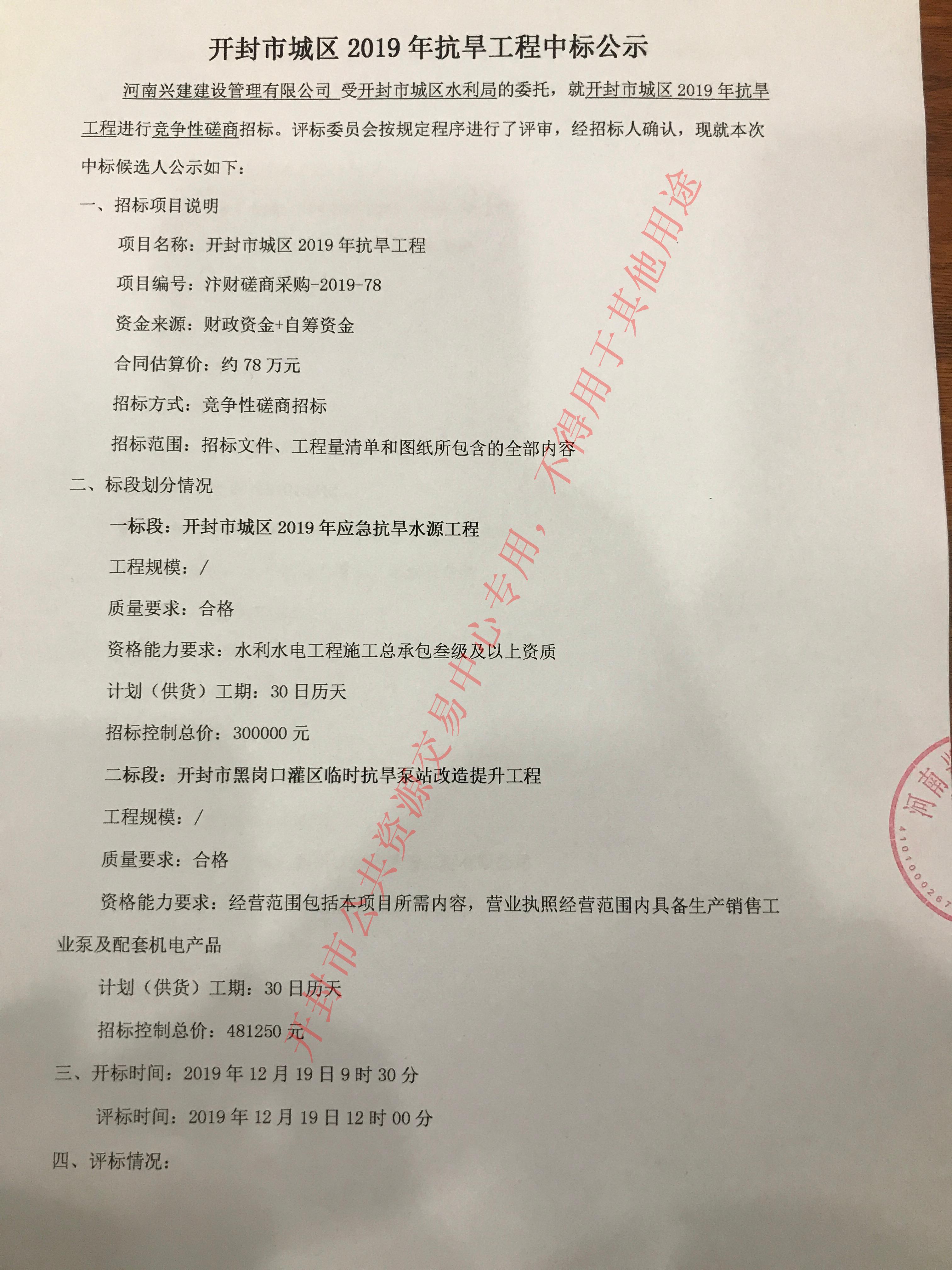 开封市城区2019年抗旱工程中标公示
