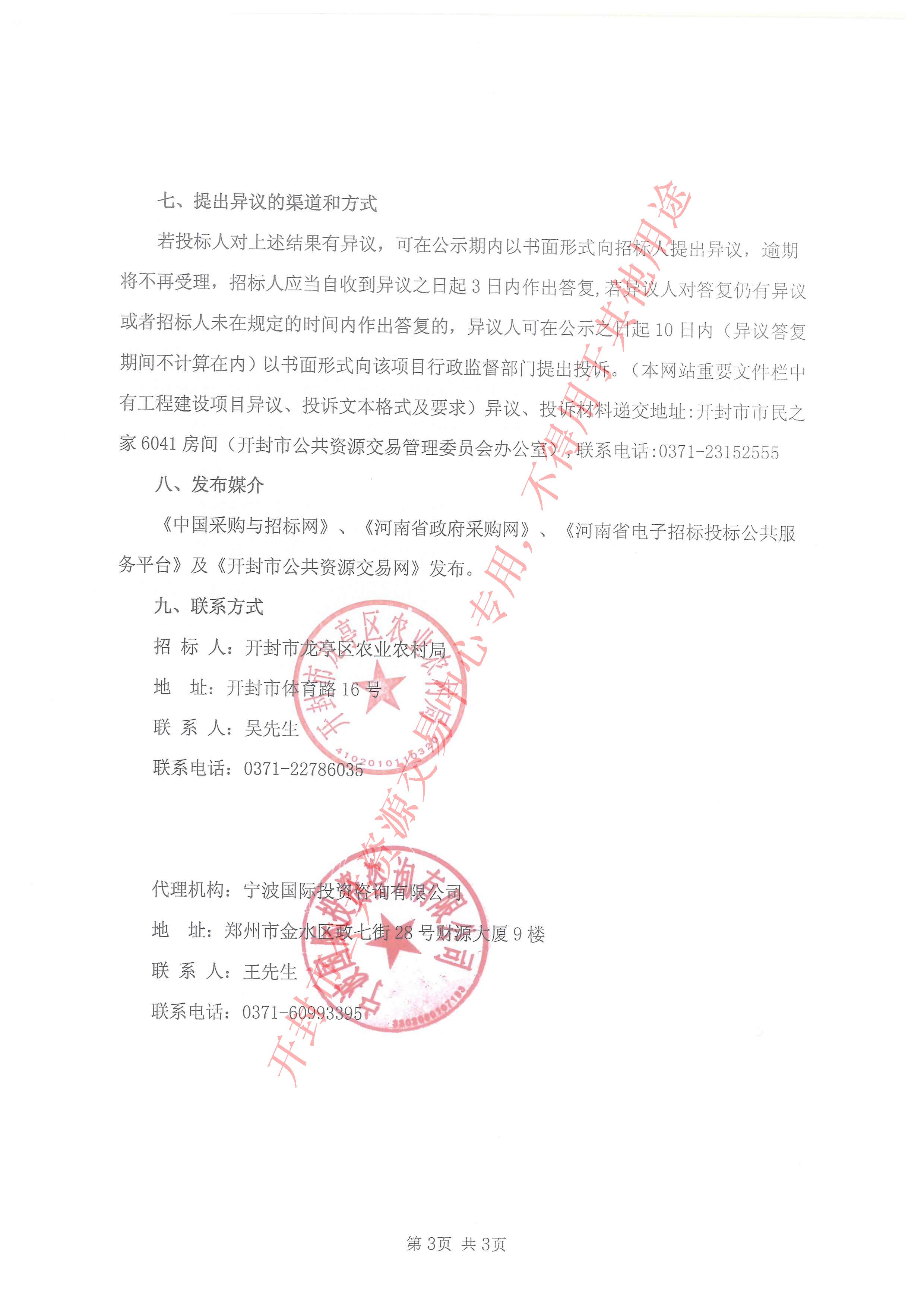 若投标人对上述结果有异议,可在公示期内以书面形式向招标人提出异议,逾期将不再受理,招标人应当自收到异议之日起3日内作出答复,若异议人对答复仍有异议或者招标人未在规定的时间内作出答复的,异议人可在公示之日起10日内(异议答复期间不计算在内)以书面形式向该项目行政监督部门提出投诉。(本网站重要文件栏中有工程建设项目异议、投诉文本格式及要求)异议、投诉材料递交地址:开封市市民之家6041房间(开封市公共资源交易管理委员会办公室),联系电话:0371-23152555