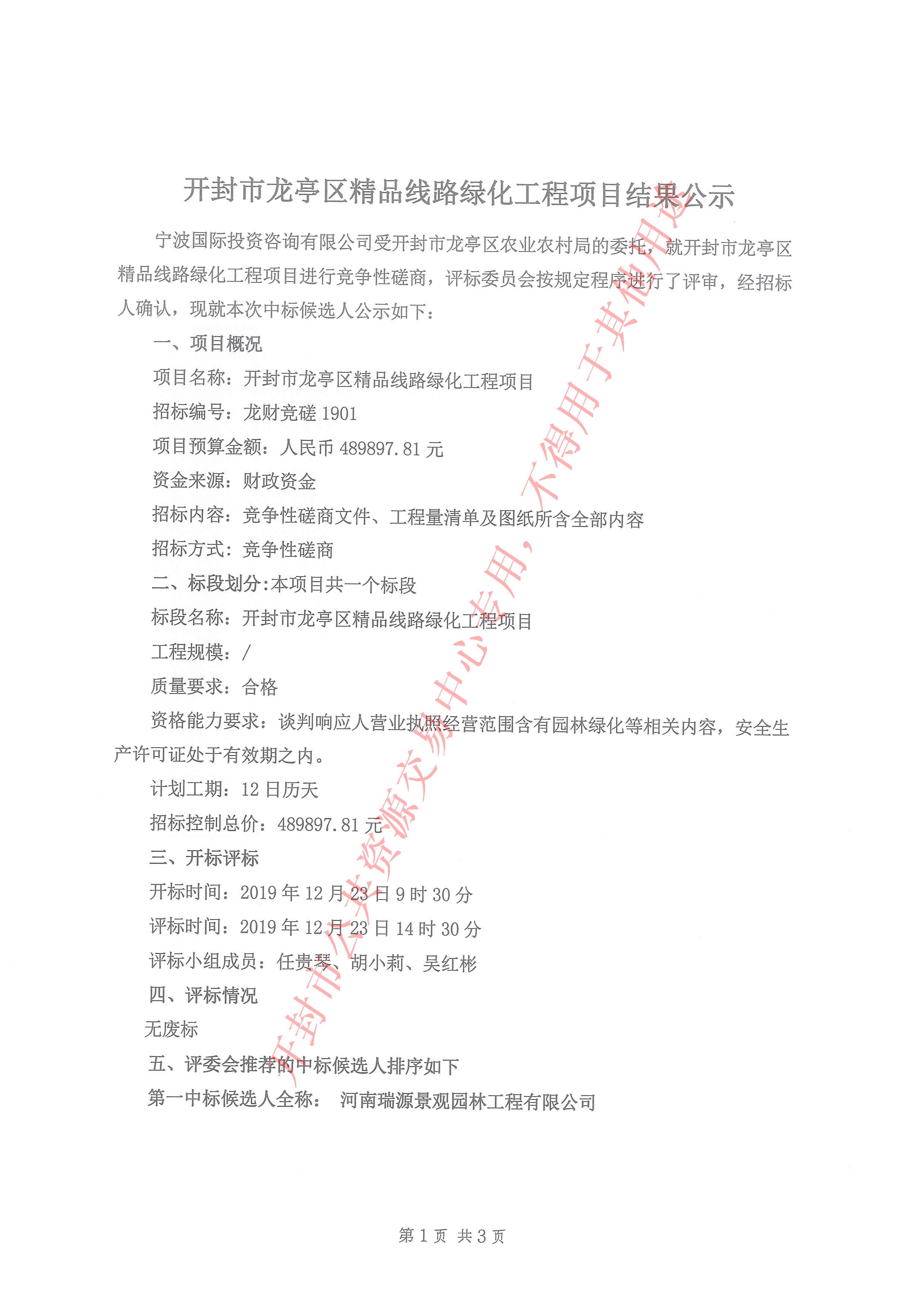 宁波国际投资咨询有限公司受开封市龙亭区农业农村局的委托,就开封市龙亭区精品线路绿化工程项目进行竞争性磋商,评标委员会按规定程序进行了评审,经招标人确认,现就本次中标候选人公示如下: