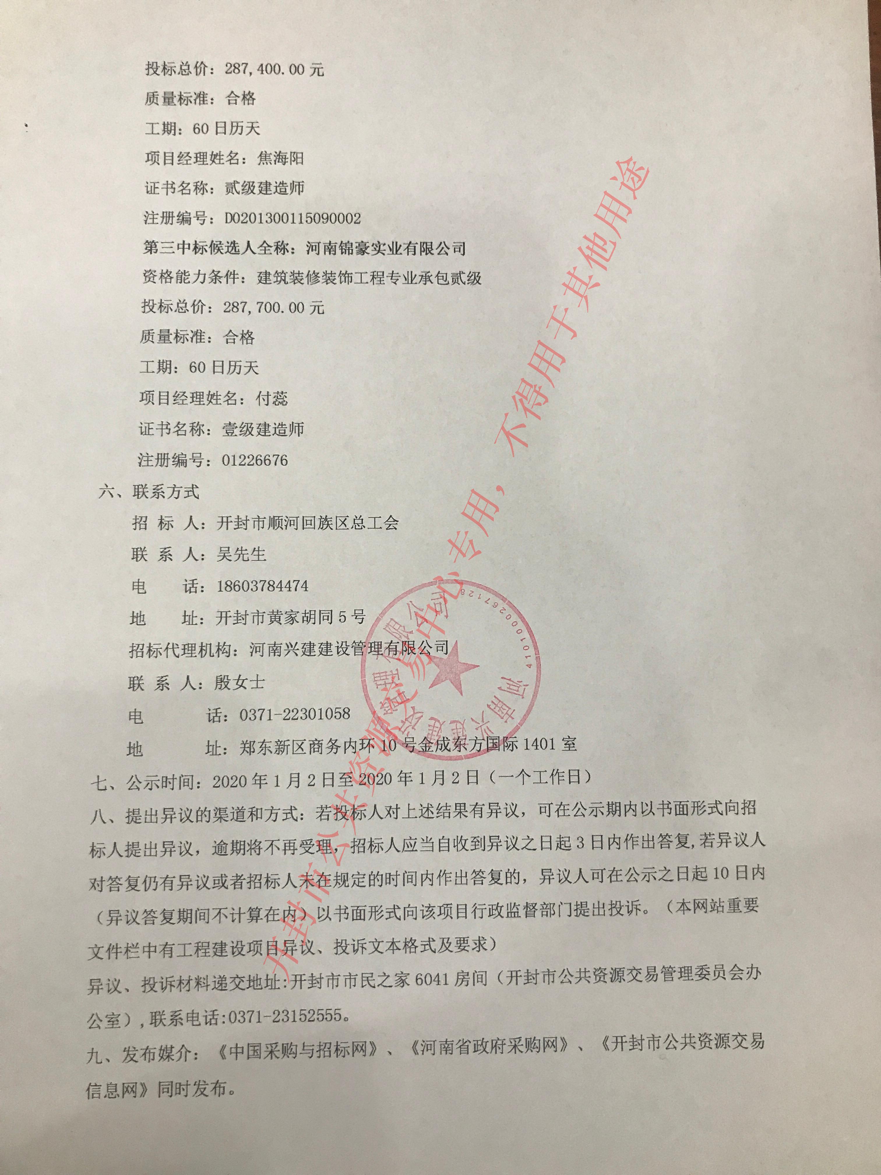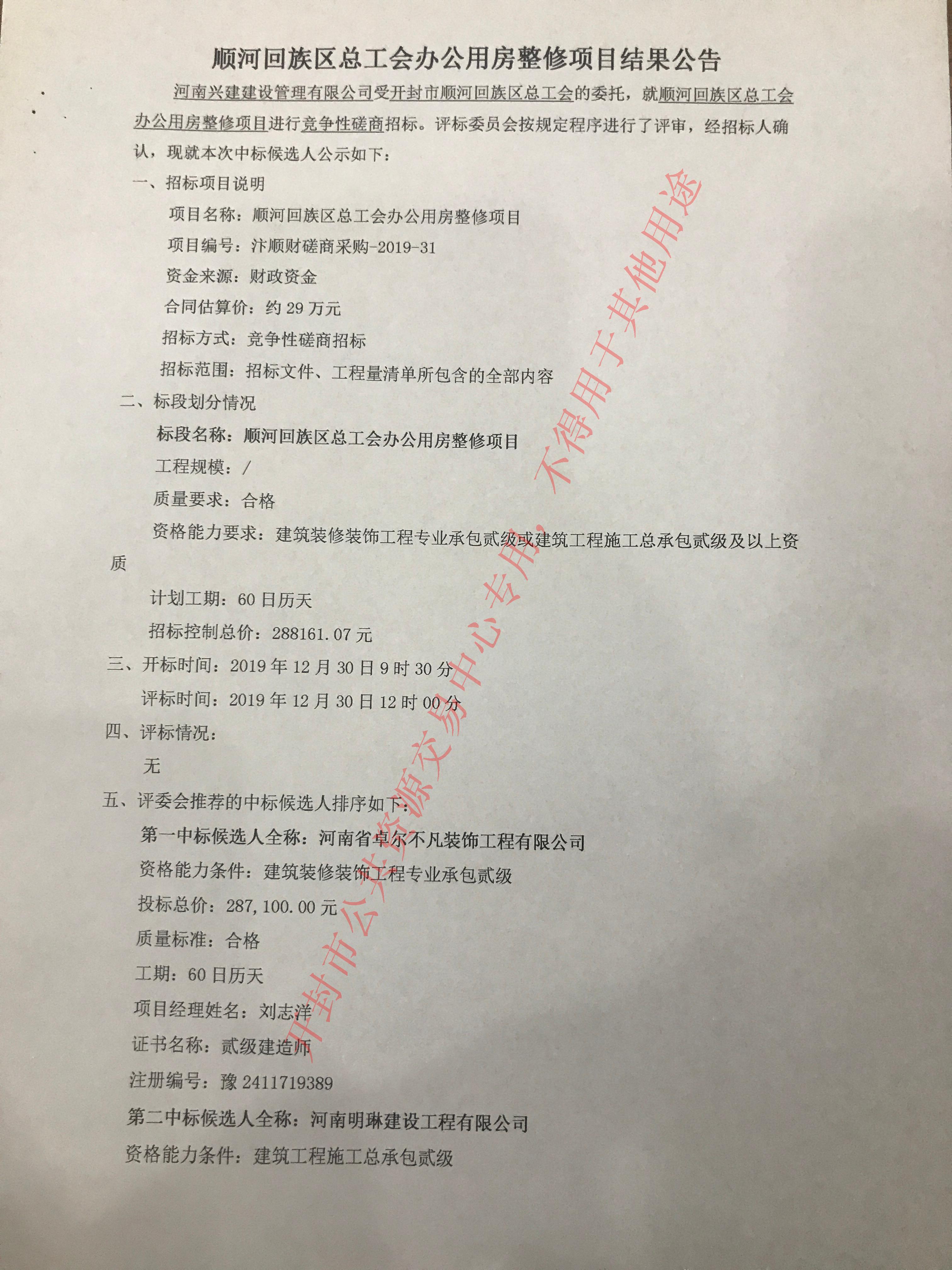 河南兴建建设管理有限公司受开封市顺河回族区总工会的委托,就顺河回族区总工会办公用房整修项目进行竞争性磋商招标。评标委员会按规定程序进行了评审,经招标人确认,现就本次中标候选人公示如下: