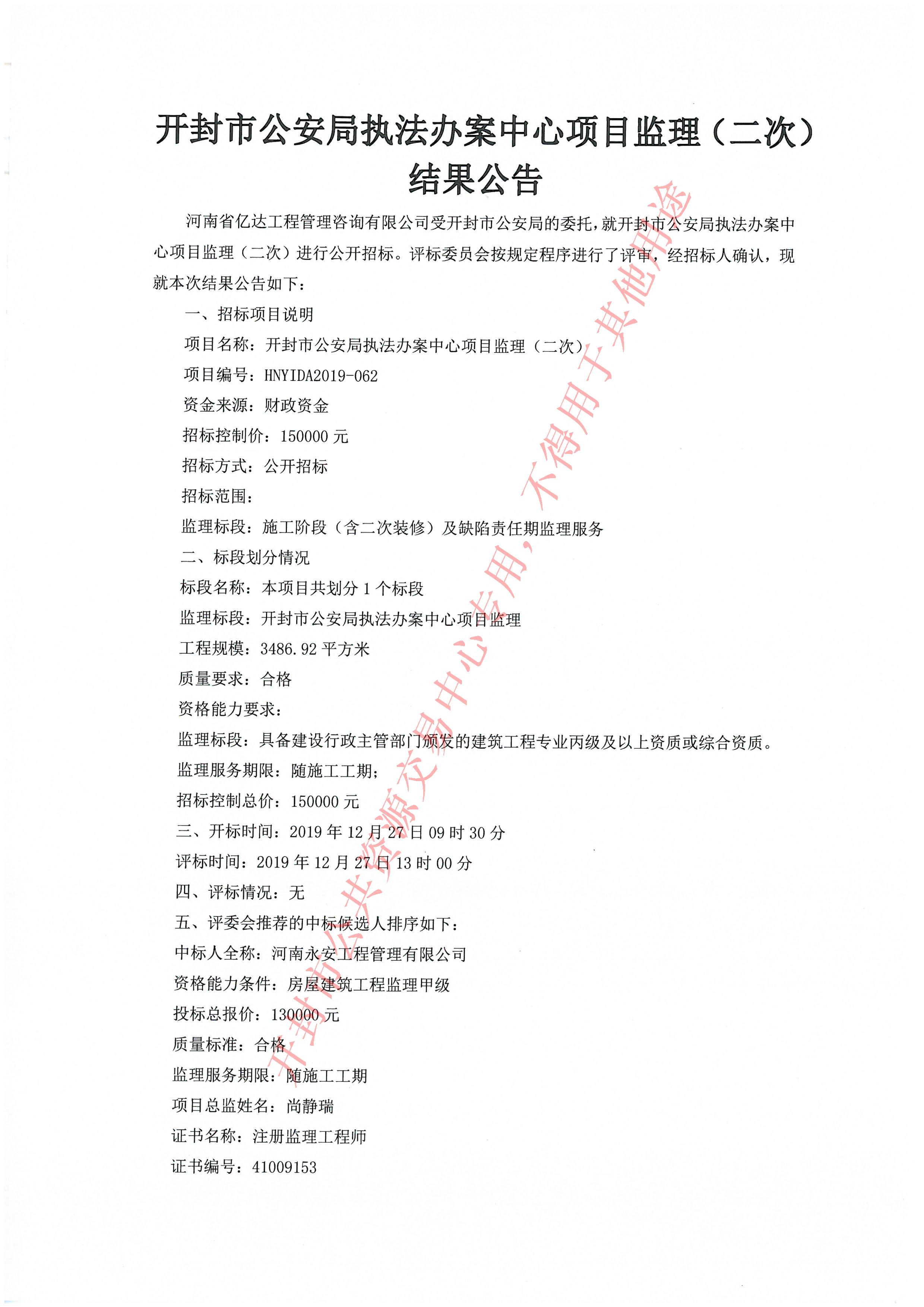 河南省亿达工程管理咨询有限公司受开封市公安局的委托,就开封市公安局执法办案中心项目监理(二次)进行公开招标。评标委员会按规定程序进行了评审,经招标人确认,现就本次结果公告如下: