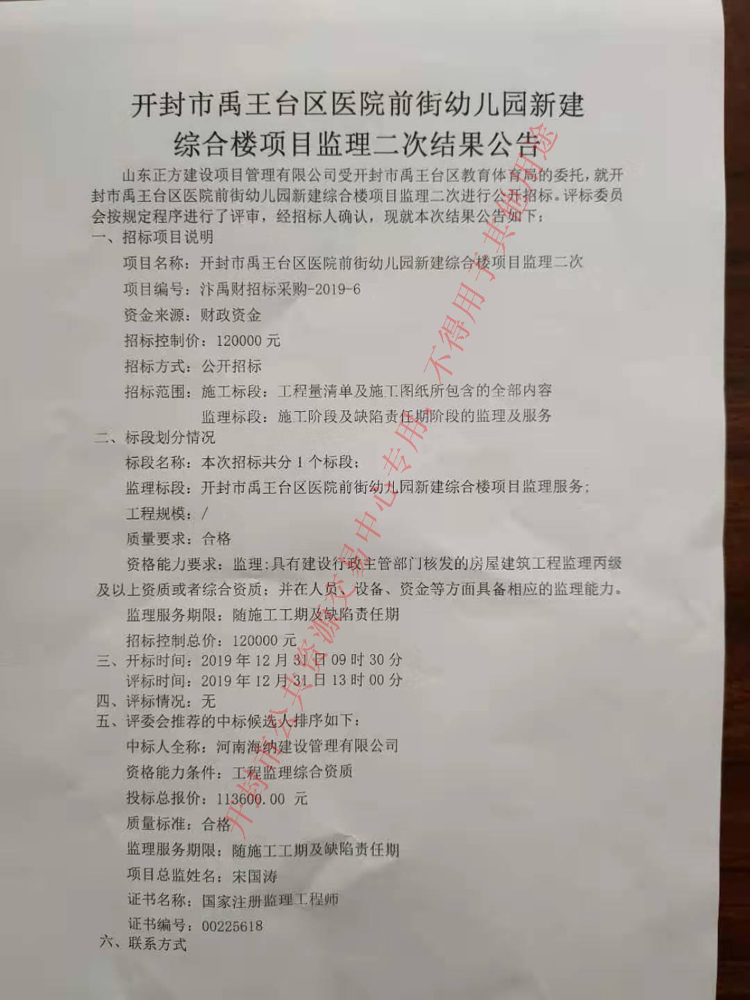 山东正方建设项目管理有限公司受开封市禹王台区教育体育局的委托,就开封市禹王台区医院前街幼儿园新建综合楼项目监理二次进行公开招标。评标委员会按规定程序进行了评审,经招标人确认,现就本次结果公告如下: