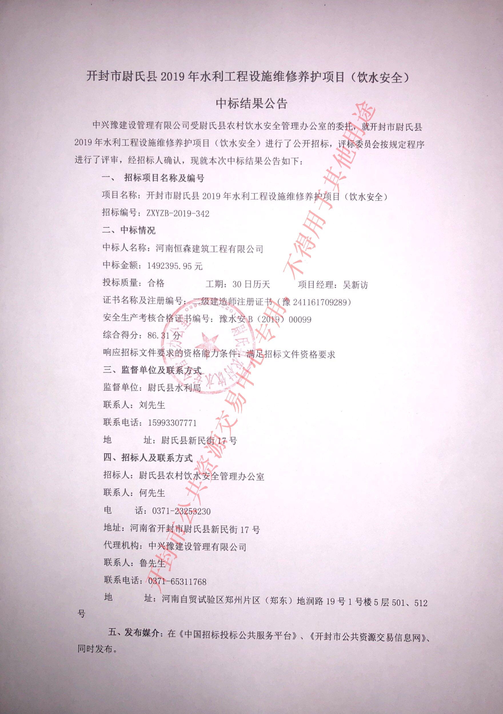 中兴豫建设管理有限公司受尉氏县农村饮水安全管理办公室的委托,就开封市尉氏县2019年水利工程设施维修养护项目(饮水安全)进行了公开招标,评标委员会按规定程序进行了评审,经招标人确认,现就本次中标结果公告如下:
