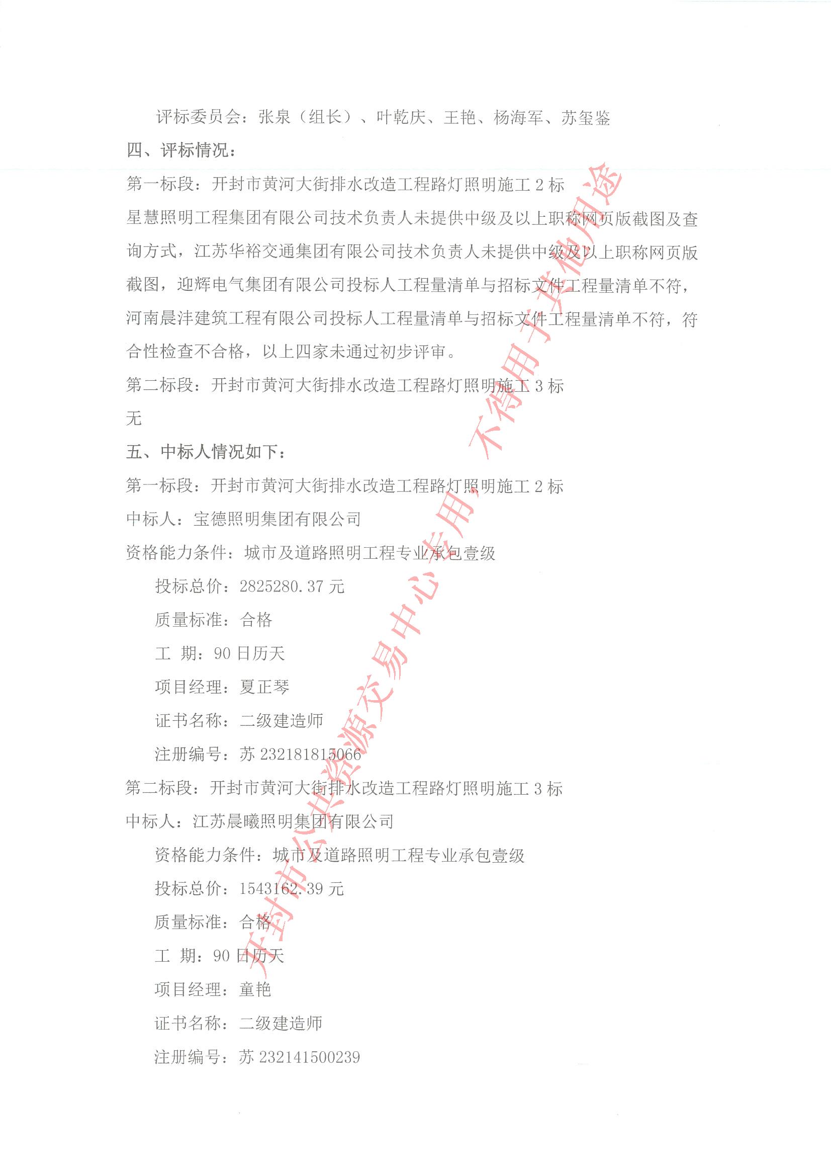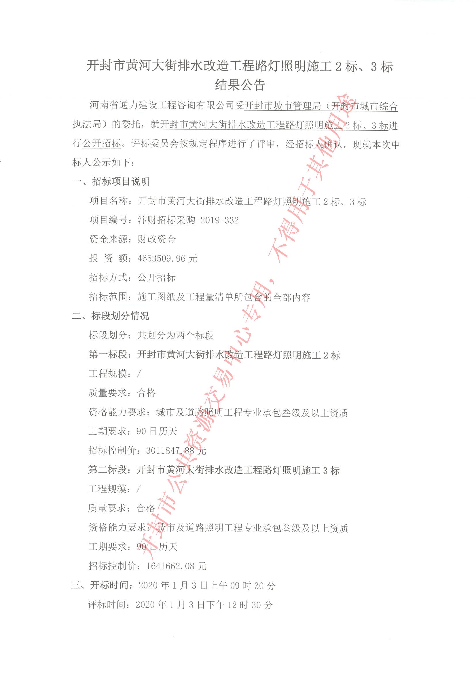 河南省通力建设工程咨询有限公司受开封市城市管理局(开封市城市综合执法局)的委托,就开封市黄河大街排水改造工程路灯照明施工2标、3标进行公开招标。评标委员会按规定程序进行了评审,经招标人确认,现就本次中标人公示如下: