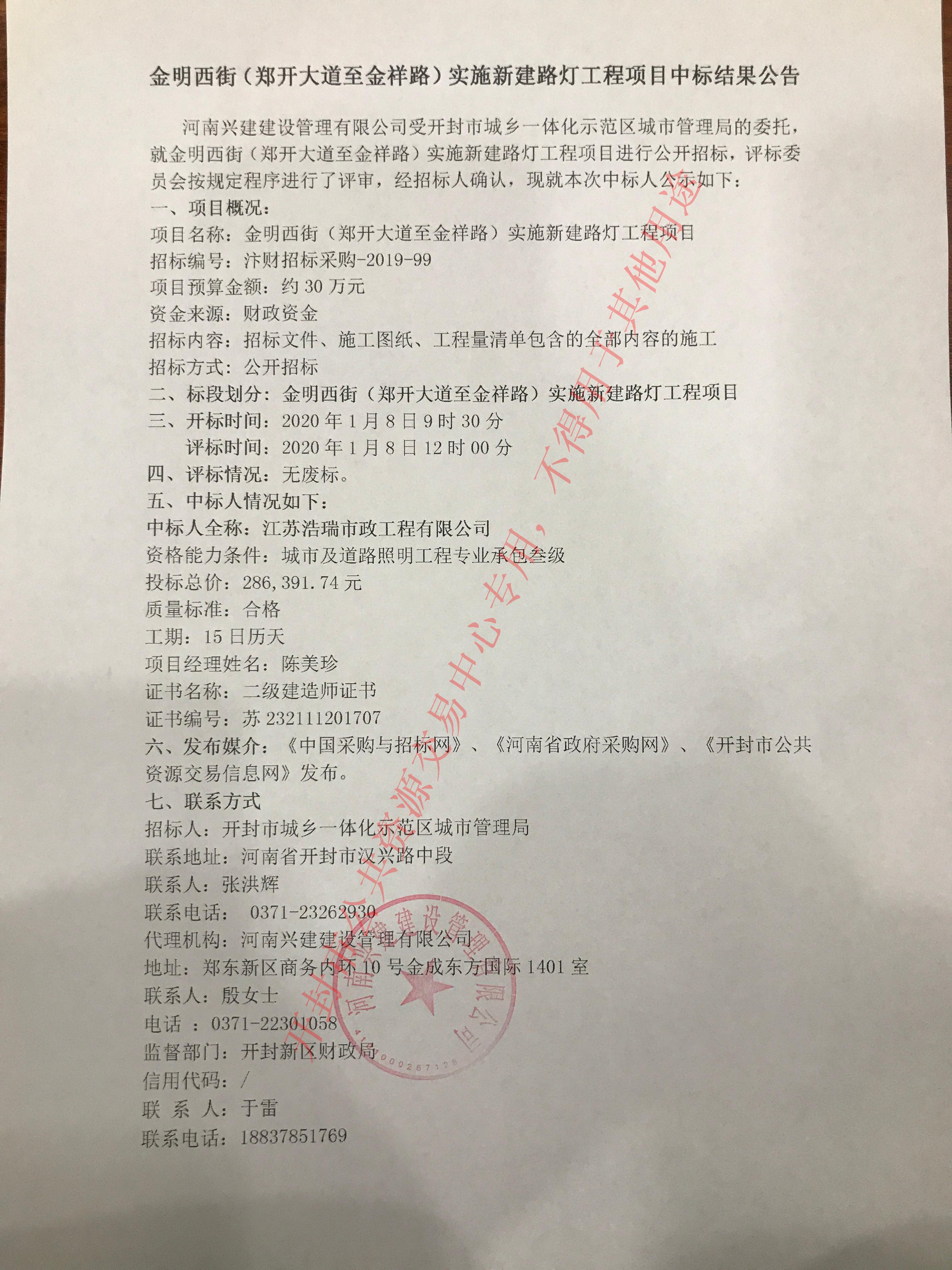 河南兴建建设管理有限公司受开封市城乡一体化示范区城市管理局的委托,就金明西街(郑开大道至金祥路)实施新建路灯工程项目进行公开招标,评标委员会按规定程序进行了评审,经招标人确认,现就本次中标人公示如下:
