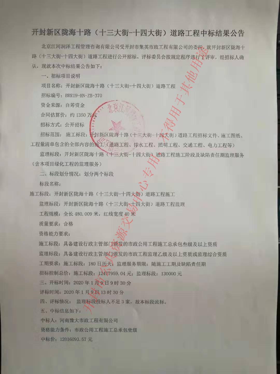 北京江河润泽工程管理咨询有限公司受开封市集英市政工程有限公司的委托,就开封新区陇海十路(十三大街-十四大街)道路工程进行公开招标。评标委员会按规定程序进行了评审,经招标人确认,现就本次中标结果公告如下: