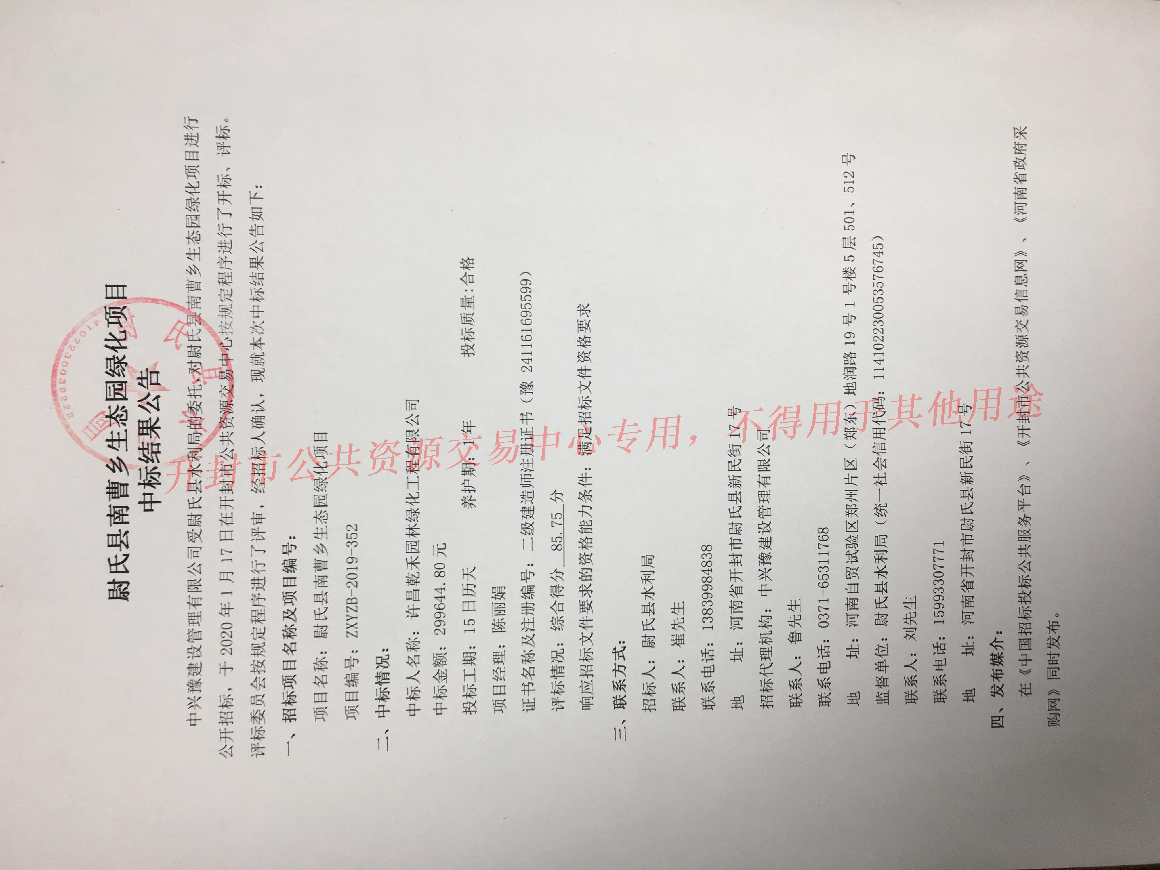 中兴豫建设管理有限公司受尉氏县水利局的委托,对尉氏县南曹乡生态园绿化项目进行公开招标,于2020年1月17日在开封市公共资源交易中心按规定程序进行了开标、评标。评标委员会按规定程序进行了评审,经招标人确认,现就本次中标结果公告如下: