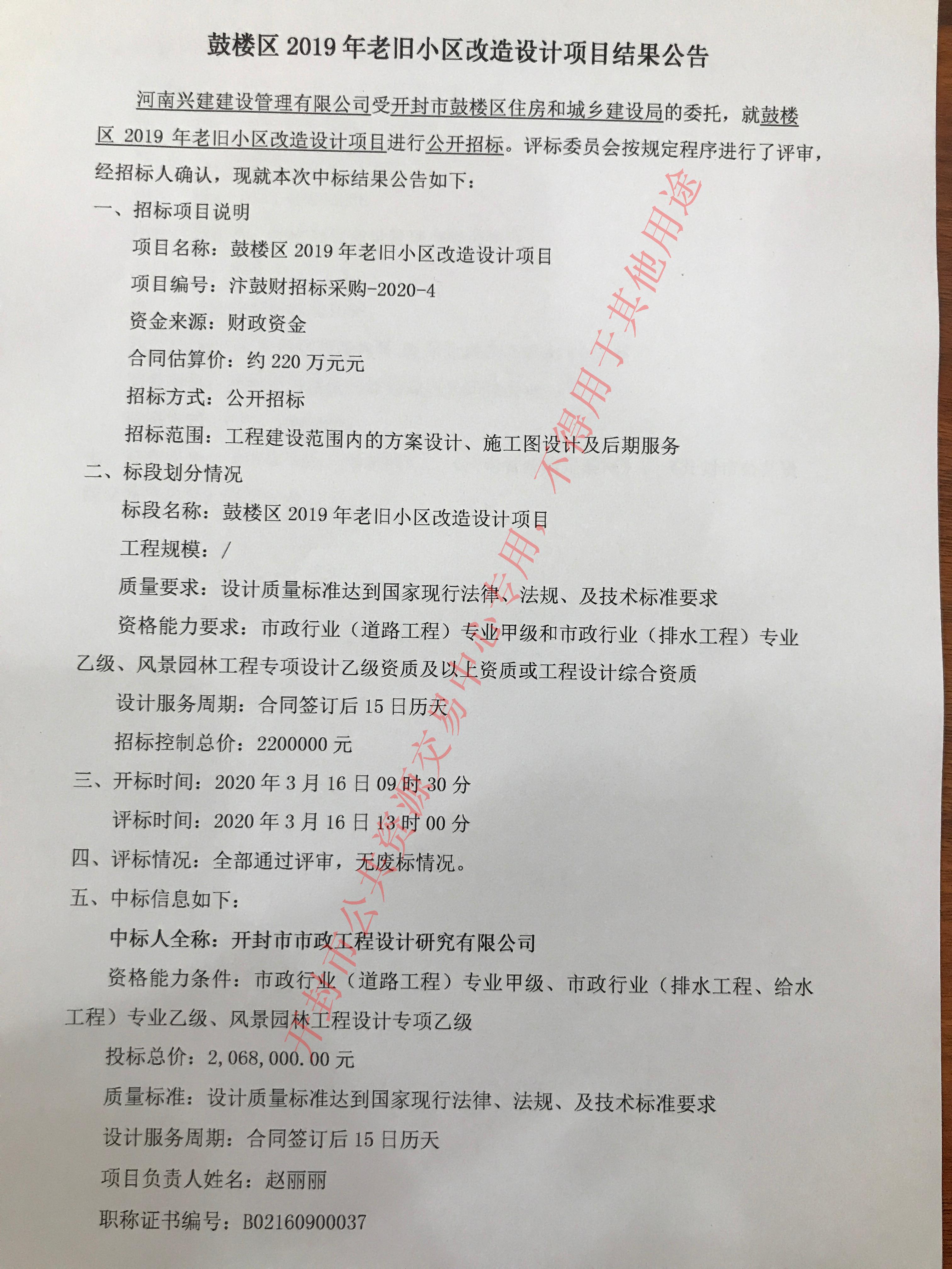 河南兴建建设管理有限公司受开封市鼓楼区住房和城乡建设局的委托,就鼓楼区2019年老旧小区改造设计项目进行公开招标。评标委员会按规定程序进行了评审,经招标人确认,现就本次中标结果公告如下: