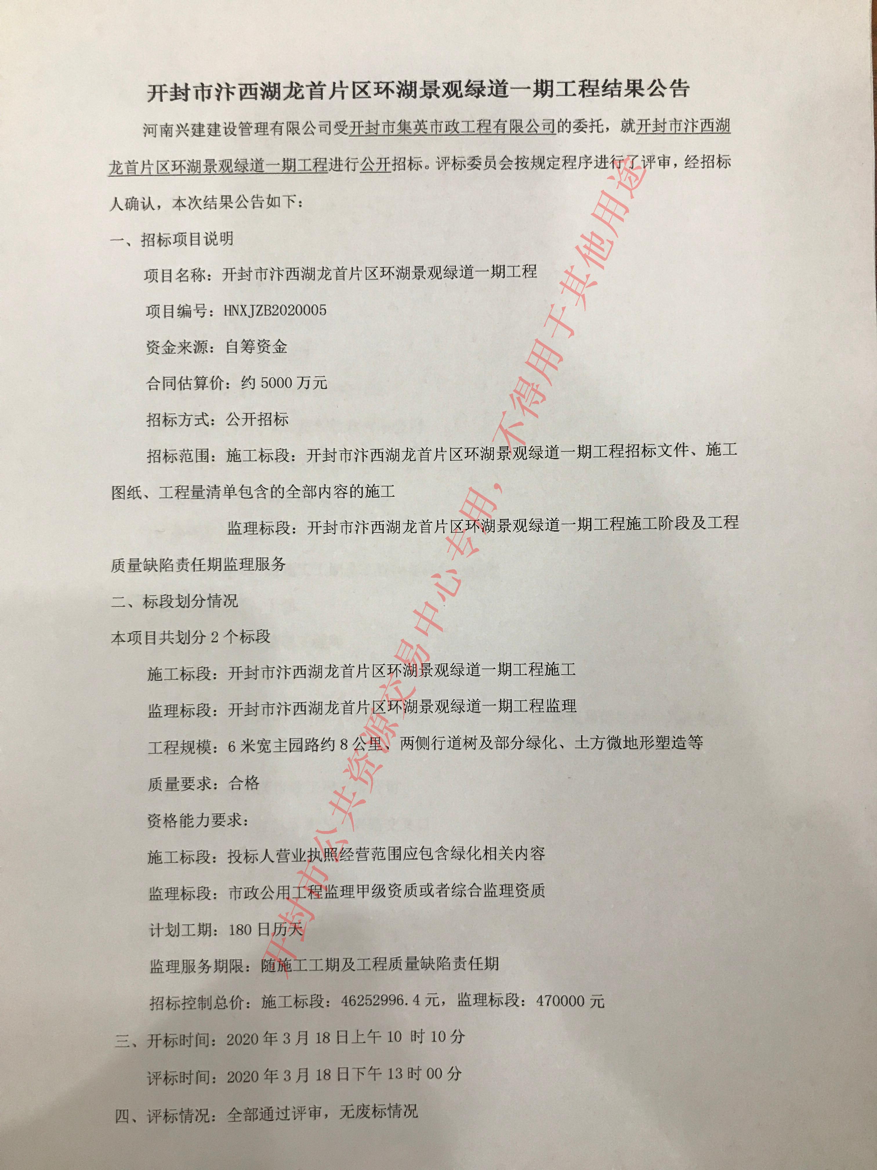 河南兴建建设管理有限公司受开封市集英市政工程有限公司的委托,就开封市汴西湖龙首片区环湖景观绿道一期工程进行公开招标。评标委员会按规定程序进行了评审,经招标人确认,本次结果公告如下:
