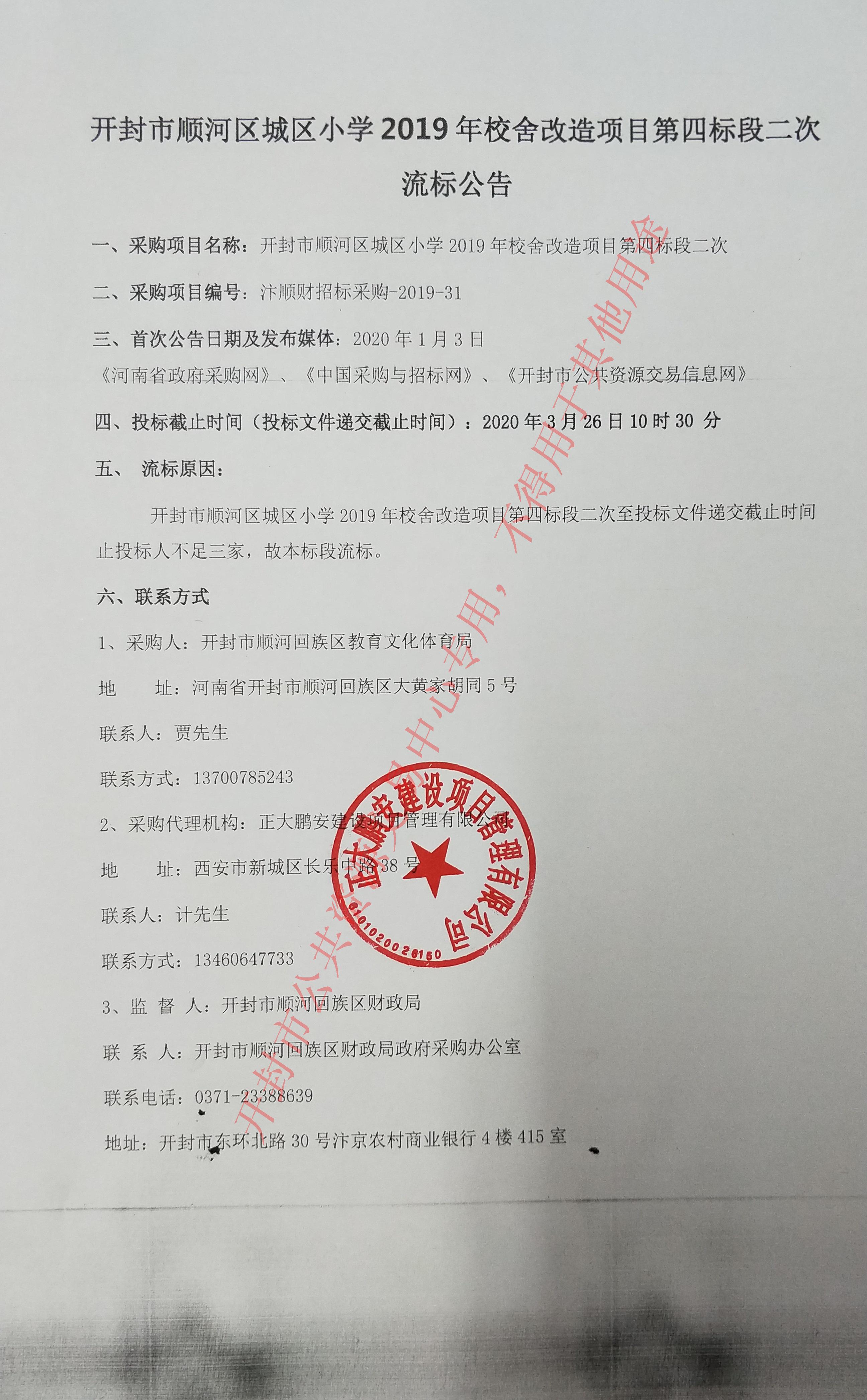 开封市顺河区城区小学2019年校舍改造项目第四标段二次至投标文件递交截止时间止投标人不足三家,故本标段流标。