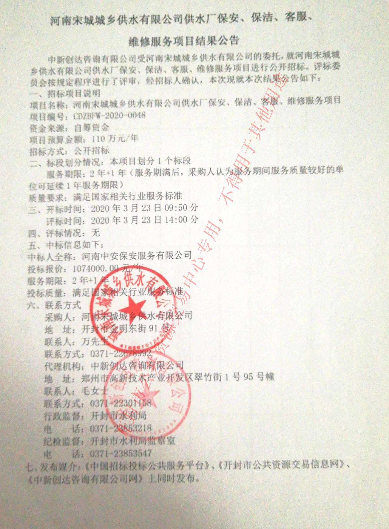 中新创达咨询有限公司受河南宋城城乡供水有限公司的委托,就河南宋城城乡供水有限公司供水厂保安、保洁、客服、维修服务项目进行公开招标。评标委员会按规定程序进行了评审,经招标人确认,本次现就本次结果公告如下: