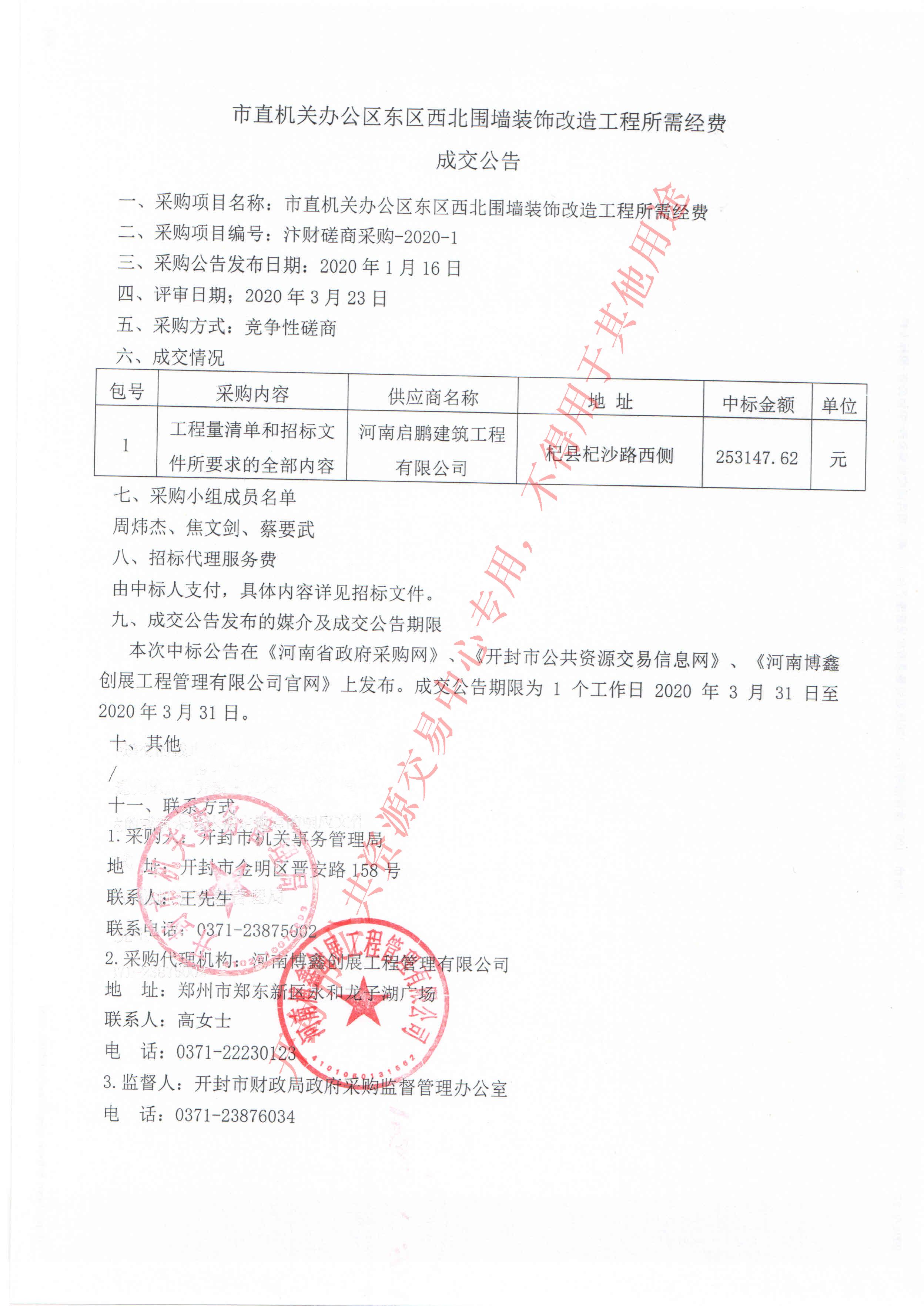 本次中标公告在《河南省政府采购网》、《开封市公共资源交易信息网》、《河南博鑫创展工程管理有限公司官网》上发布。成交公告期限为1个工作日2020年3月31日至2020年3月31日。