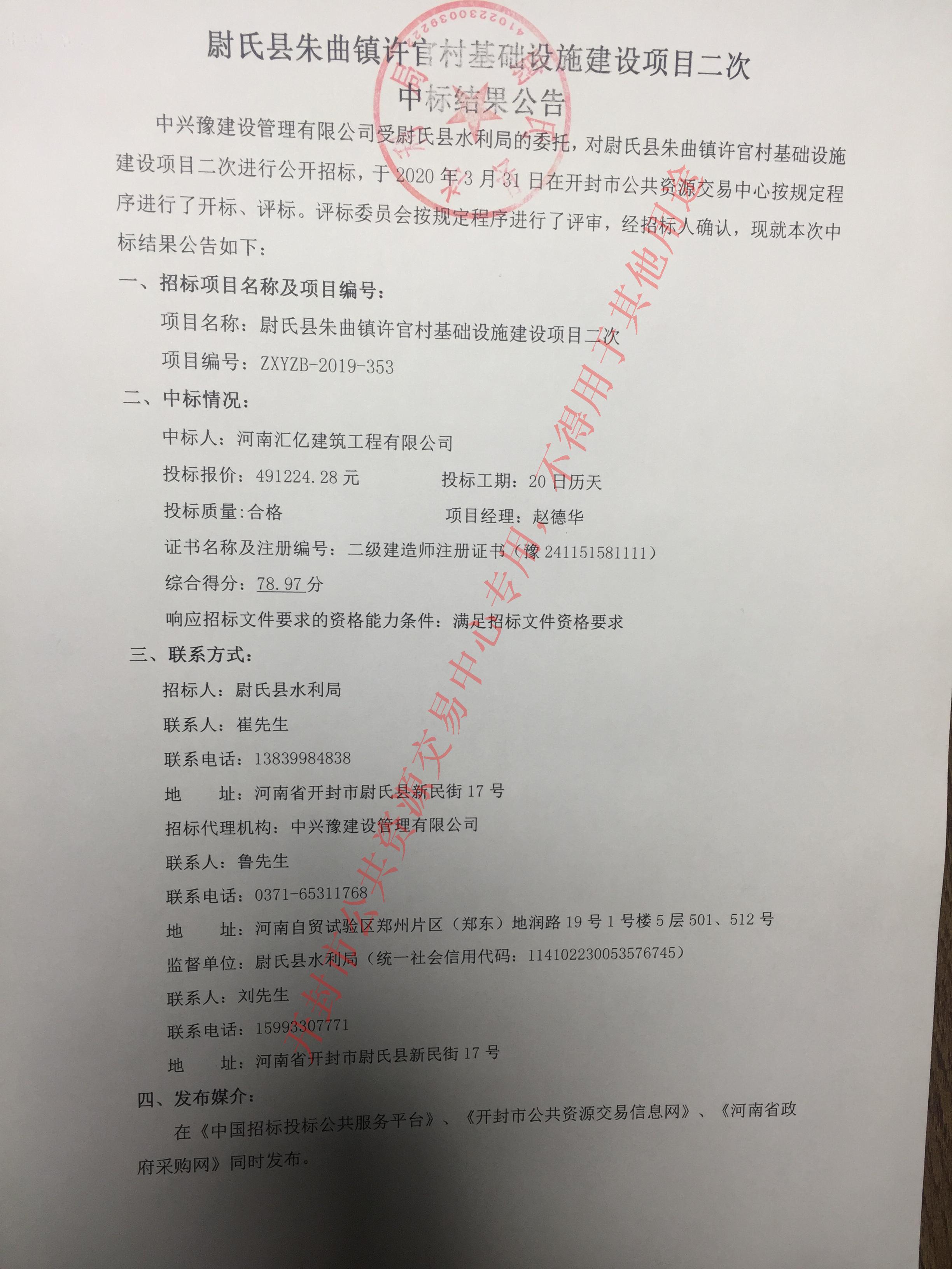 中兴豫建设管理有限公司受尉氏县水利局的委托,对尉氏县朱曲镇许官村基础设施建设项目二次进行公开招标,于2020年3月31日在开封市公共资源交易中心按规定程序进行了开标、评标。评标委员会按规定程序进行了评审,经招标人确认,现就本次中标结果公告如下: