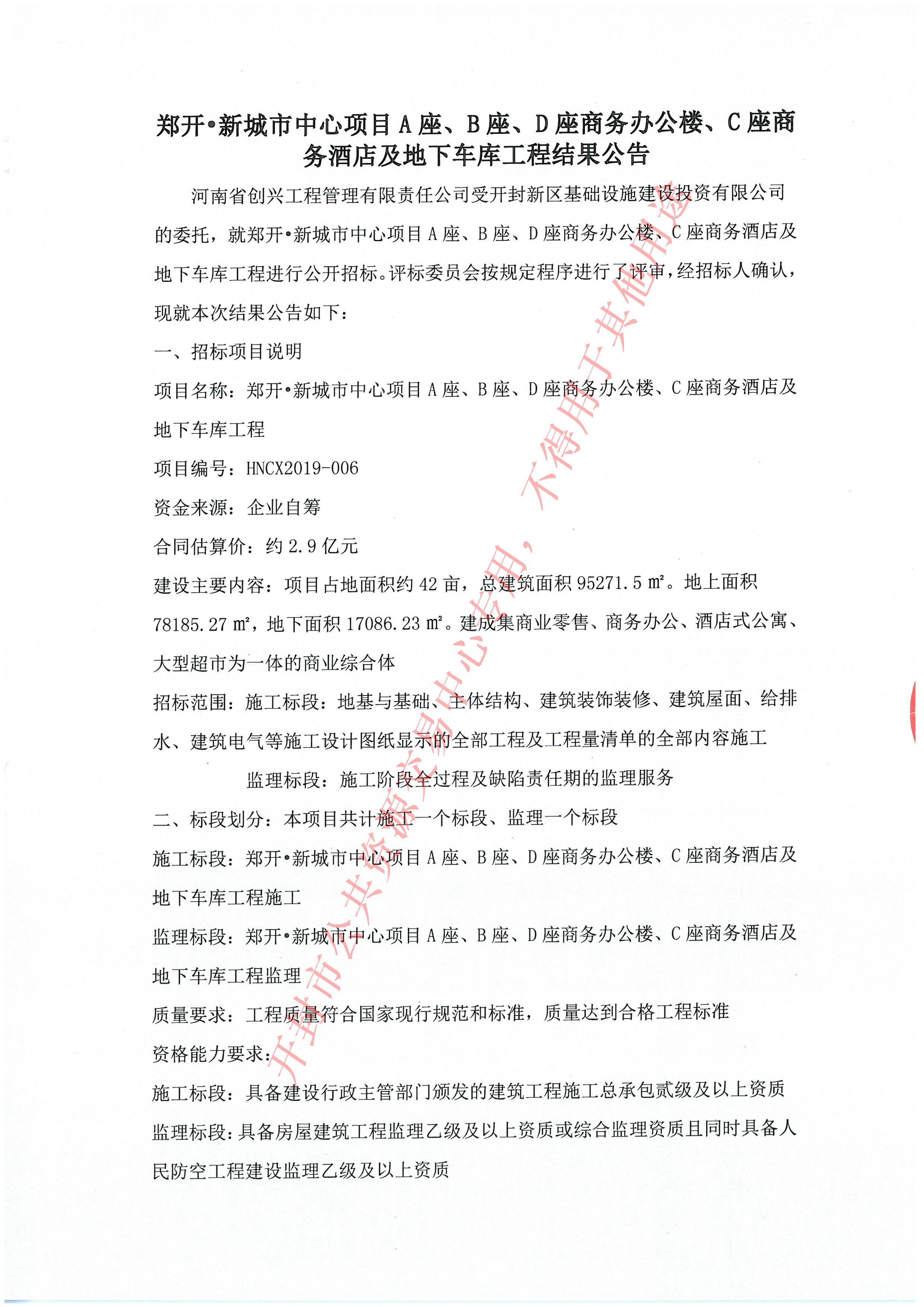 河南省创兴工程管理有限责任公司受开封新区基础设施建设投资有限公司的委托,就郑开•新城市中心项目A座、B座、D座商务办公楼、C座商务酒店及地下车库工程进行公开招标。评标委员会按规定程序进行了评审,经招标人确认,现就本次结果公告如下: