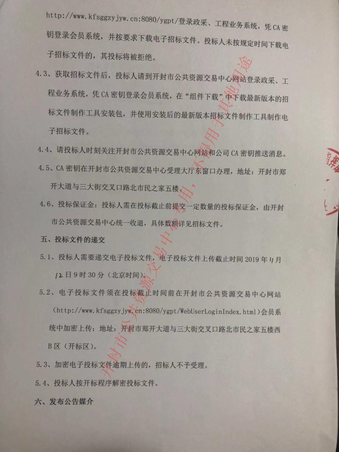 5.2、电子投标文件须在投标截止时间前在开封市公共资源交易中心网站(http://www.kfsggzyjyw.cn:8080/ygpt/WebUserLoginIndex.html)会员系统中加密上传;地址:开封市郑开大道与三大街交叉口路北市民之家五楼西B区(开标区)。